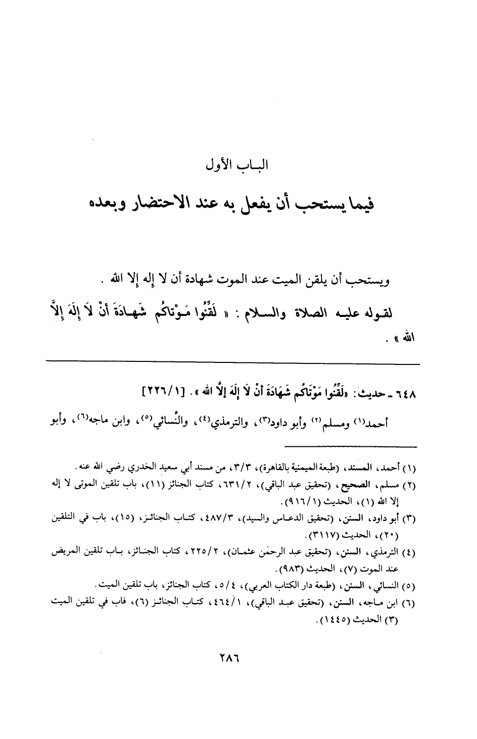 648 - حديث: "لَقِّنُوا مَوْتَاكُم شَهَادَةَ أنْ لَا إِلَهَ إلَّا الله". أحمد ومسلم وأبو داود، والترمذي، والنسائي، وابن ماجه، وأبو