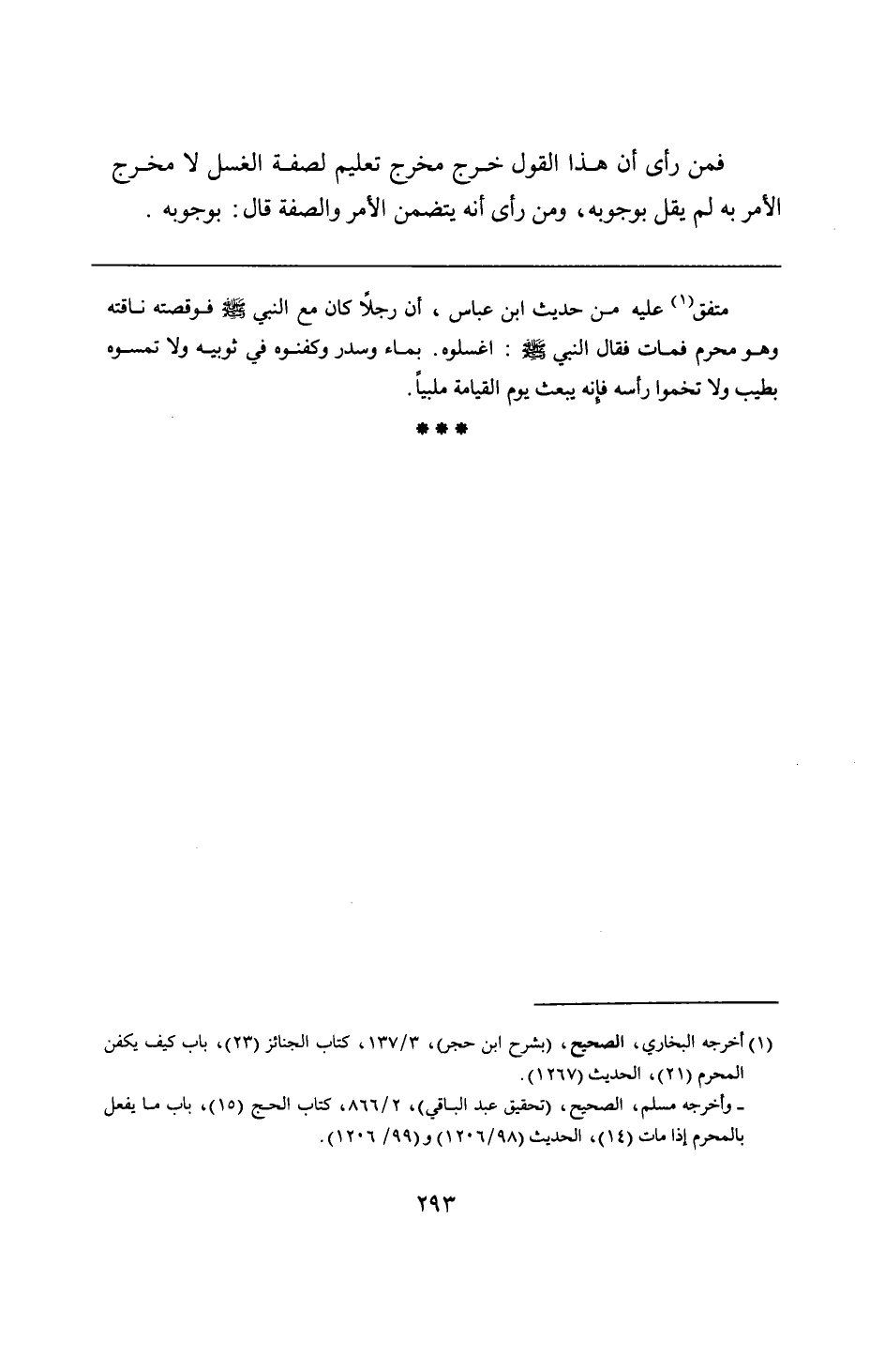 متفق عليه من حديث ابن عباس، أن رجلًا كان مع النبي - صلى الله عليه وسلم - فوقصته ناقته وهو محرم فمات فقال النبي - صلى الله عليه وسلم -: اغسلوه بماء وسدر وكفنوه في ثوبيه ولا تمسوه بطيب ولا تخموا رأسه فإِنه يبعث يوم القيامة ملبيًا.