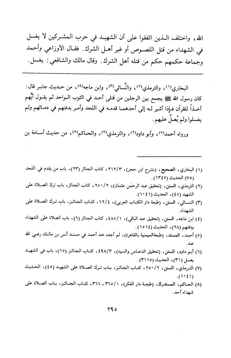 البخاري، والترمذي، والنَّسائي، وابن ماجه، من حديث جابر قال: كان رسول الله - صلى الله عليه وسلم - يجمع بين الرجلين من قتلى أحد في الثوب الواحد ثم يقول أيُّهم أخذًا للقرآن فإِذا أشير له إلى أحدهما قدمه في اللحد وأمر بدفنهم في دمائهم ولم يغسلوا ولم يُصلِّ عليهم.