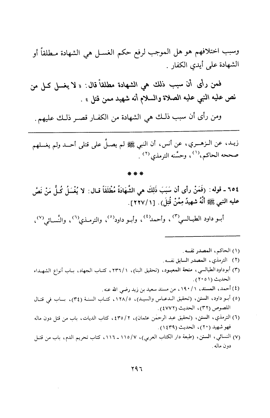 654 - قوله: (فَمَنْ رأى أن سَبَبَ ذَلِكَ هي الشَّهَادَةُ مُطْلَقًا قال: لا يُغْسَلُ كُلُّ مَنْ نَصَّ عليه النبي - صلى الله عليه وسلم - أنَّهُ شهيدٌ مِمَّنْ قُتِلَ).