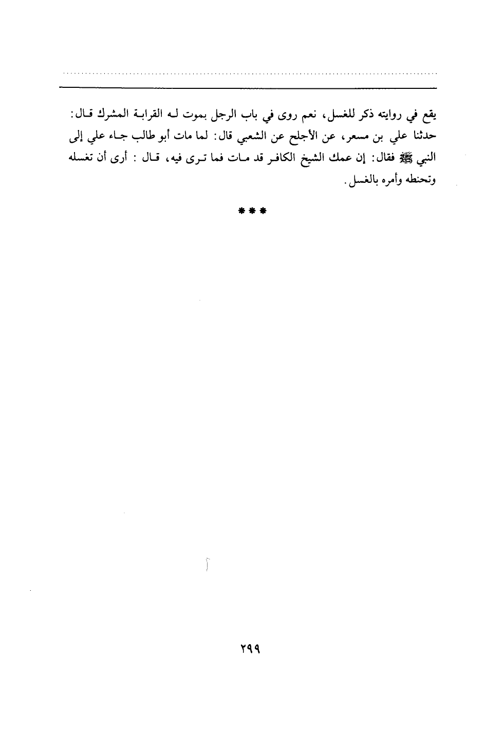 يقع في روايته ذكر للغسل، نعم روى في باب الرجل بموت له القرابة المشرك قال: حدثنا علي بن مسعر، عن الأجلح عن الشعبي قال: لما مات أبو طالب جاء علي إلى النبي - صلى الله عليه وسلم - فقال: إن عمك الشيخ الكافر قد مات فما ترى فيه، قال: أرى أن تغسله وتحنطه وأمره بالغسل.
