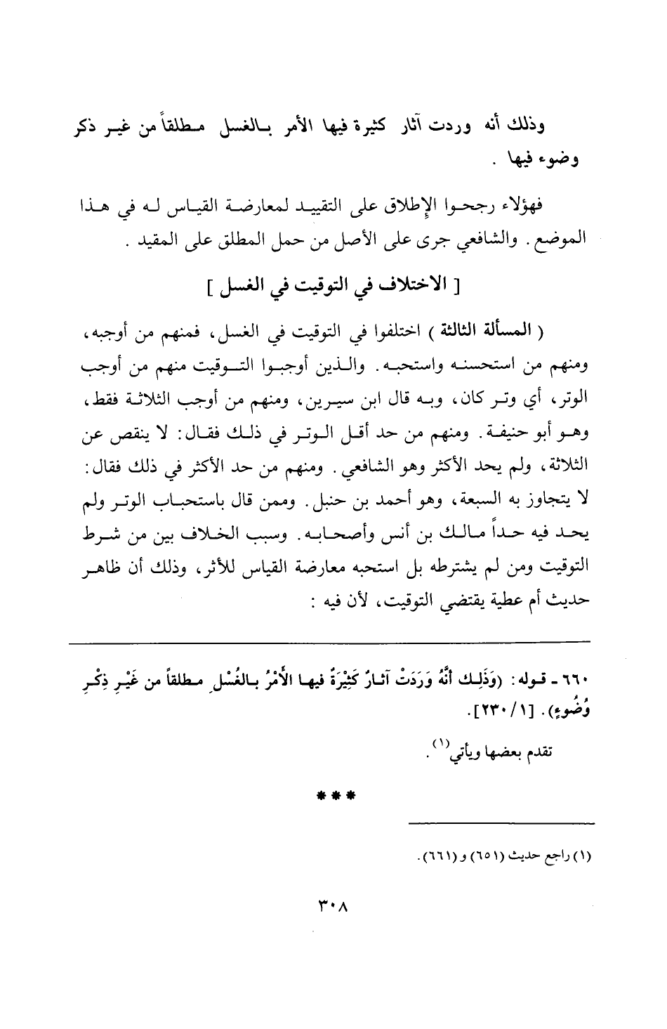 660 - قوله: (وَذَلِك أنَّهُ وَرَدَتْ آثارٌ كِثْيرَةٌ فيها الأَمْرُ بالغُسْلِ مطلقًا من غَيْرِ ذِكْرِ وُضُوءٍ).