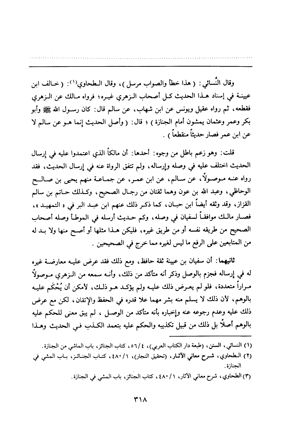 وقال النَّسائي: (هذا خطأ والصواب مرسل)، وقال الطحاوي: (خالف ابن عيينة في إسناد هذا الحديث كل أصحاب الزهري غيره؛ فرواه مالك عن الزهري فقطعه، ثم رواه عقيل ويونس عن ابن شهاب، عن سالم قال: كان رسول الله - صلى الله عليه وسلم - وأبو بكر وعمر وعثمان يمشون أمام الجنازة)؛ قال: (وأصل الحديث إِنما هو عن سالم لا عن ابن عمر فصار حديثًا منقطعًا).