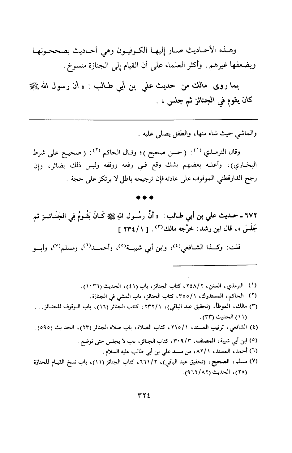 672 - حديث علي بن أبي طالب: "أنَّ رسُول اللهِ - صلى الله عليه وسلم - كَانَ يَقُومُ فِي الجَنَائز ثم جَلَسَ"، قال ابن رشد: خرَّجه مالك.