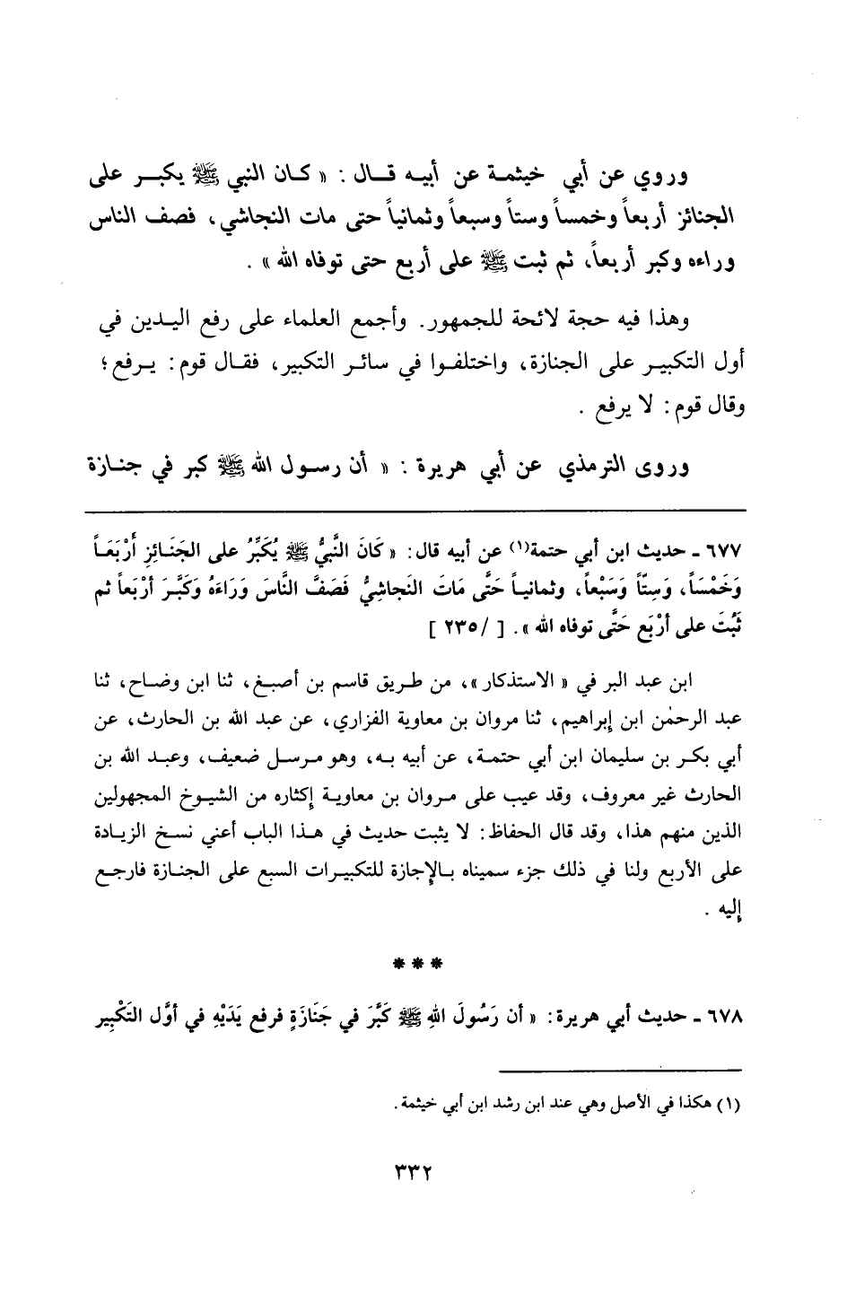 678 - حديث أبي هريرة: "أن رَسُولَ اللهِ - صلى الله عليه وسلم - كَبَّرَ في جَنَازَةٍ فرفع يَدَيْهِ في أوَّل التَكْبِير