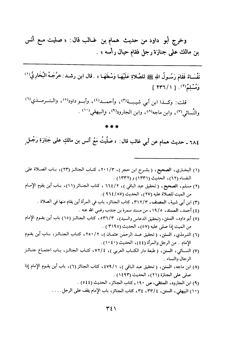 نَفْسَاءُ فَقَامَ رَسُولُ اللهِ - صلى الله عليه وسلم - للصَّلاةِ عَلَيْهَا وَسْطَهَا". قال ابن رشد: خرَّجَهُ البُخَارِيُّ وَمُسْلِمٌ.