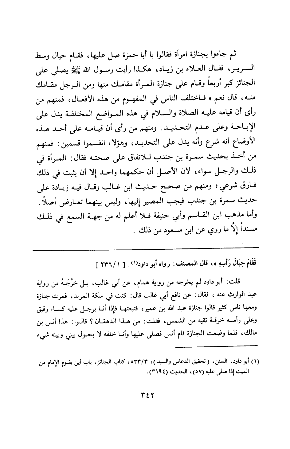 قلت: أبو داود لم يخرجه من رواية همام، عن أبي غالب، بل خرَّجَهُ من رواية عبد الوارث عنه، فقال: عن نافع أبي غالب قال: كنت في سكة المربد، فمرت جنازة ومعها ناس كثير قالوا جنازة عبد الله بن عمير، فتبعتها فإِذا أنا برجل عليه كساء رقيق وعلى رأسه خرقة تقيه من الشمس، فقلت: من هذا الدهقان؟ قالوا: هذا أنس بن مالك، فلما وضعت الجنازة قام أنس فصلى عليها وأنا خلفه لا يحول بيني وبينه شيء