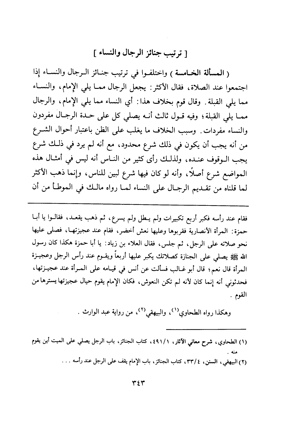 فقام عند رأسه فكبر أربع تكبيرات ولم يطل ولم يسرع، ثم ذهب يقعد، فقالوا يا أبا حمزة: المرأة الأنصارية فقربوها وعليها نعش أخضر، فقام عند عجيزتها، فصلى عليها نحو صلاته على الرجل، ثم جلس، فقال العلاء بن زياد: يا أبا حمزة هكذا كان رسول الله - صلى الله عليه وسلم - يصلي على الجنازة كصلاتك يكبر عليها أربعًا ويقوم عند رأس الرجل وعجيزة المرأة قال نعم؛ قال أبو غالب فسألت عن أنس في قيامه على المرأة عند عجيزتها، فحدثوني أنه إِنما كان لأنه لم تكن النعوش، فكان الإِمام يقوم حيال عجيزتها يسترها من القوم.