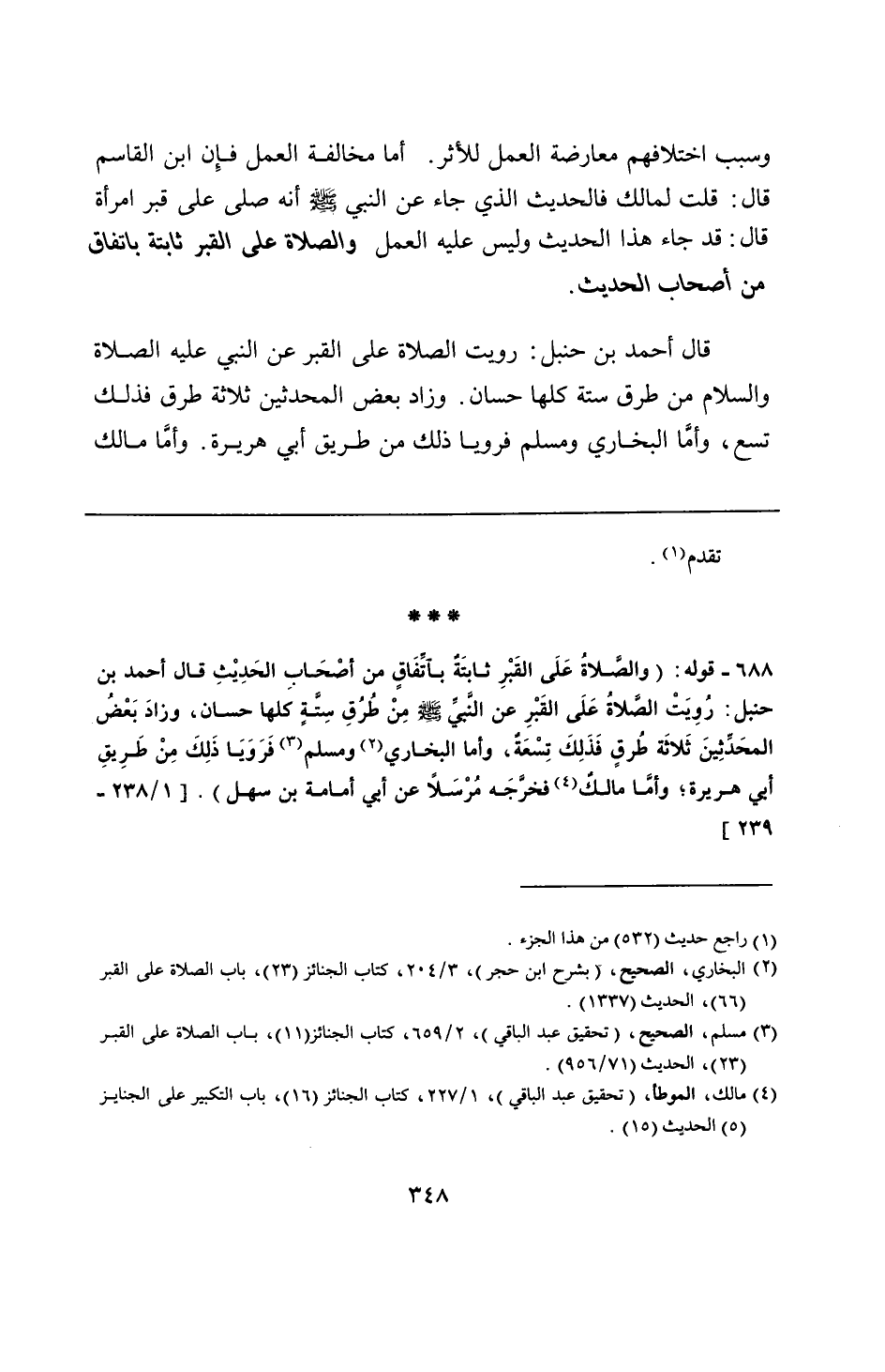 688 - قوله: (والصَّلاةُ عَلَى القَبْرِ ثابتَةٌ باتَّفَاقٍ من أصْحَابِ الحَدِيْثِ قال أحمد بن حنبل: رُوِيَتْ الصَّلاةُ عَلَى القَبْرِ عن النَّبيِّ - صلى الله عليه وسلم - مِنْ طُرُقِ سِتَّةٍ كلها حسان، وزادَ بَعْضُ المحَدِّثِينَ ثَلاثَة طُرقٍ فَذَلِكَ تِسْعَةٌ، وأما البخاري ومسلم فَرَوَيَا ذَلِكَ مِنْ طَرِيقِ أبي هريرة؛ وأمَّا مالكٌ فخرَّجَه مُرْسَلًا عن أبي أمامة بن سهل).