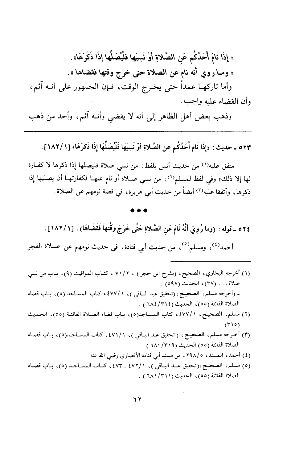 523 - حديث: "إِذَا نَامَ أَحَدُكُم عن الصَّلاةِ أوْ نَسِيَهَا فَلْيُصَلِّهَا إِذَا ذَكرَهَا".