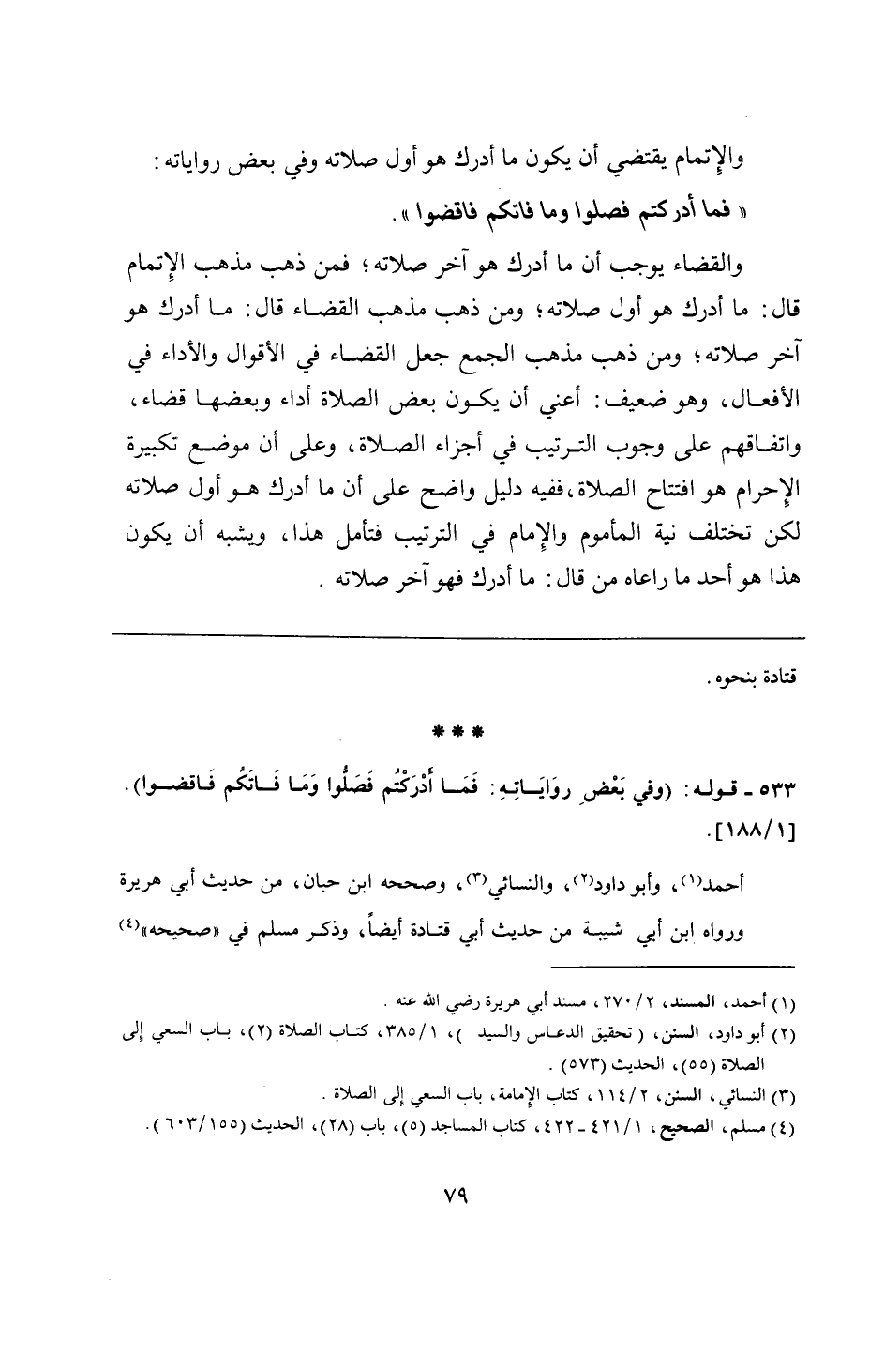 533 - قوله: (وفي بَعْضِ روَايَاتِهِ: فَمَا أَدْرَكْتُم فَصَلُّوا وَمَا فَاتَكُم فَاقضوا).