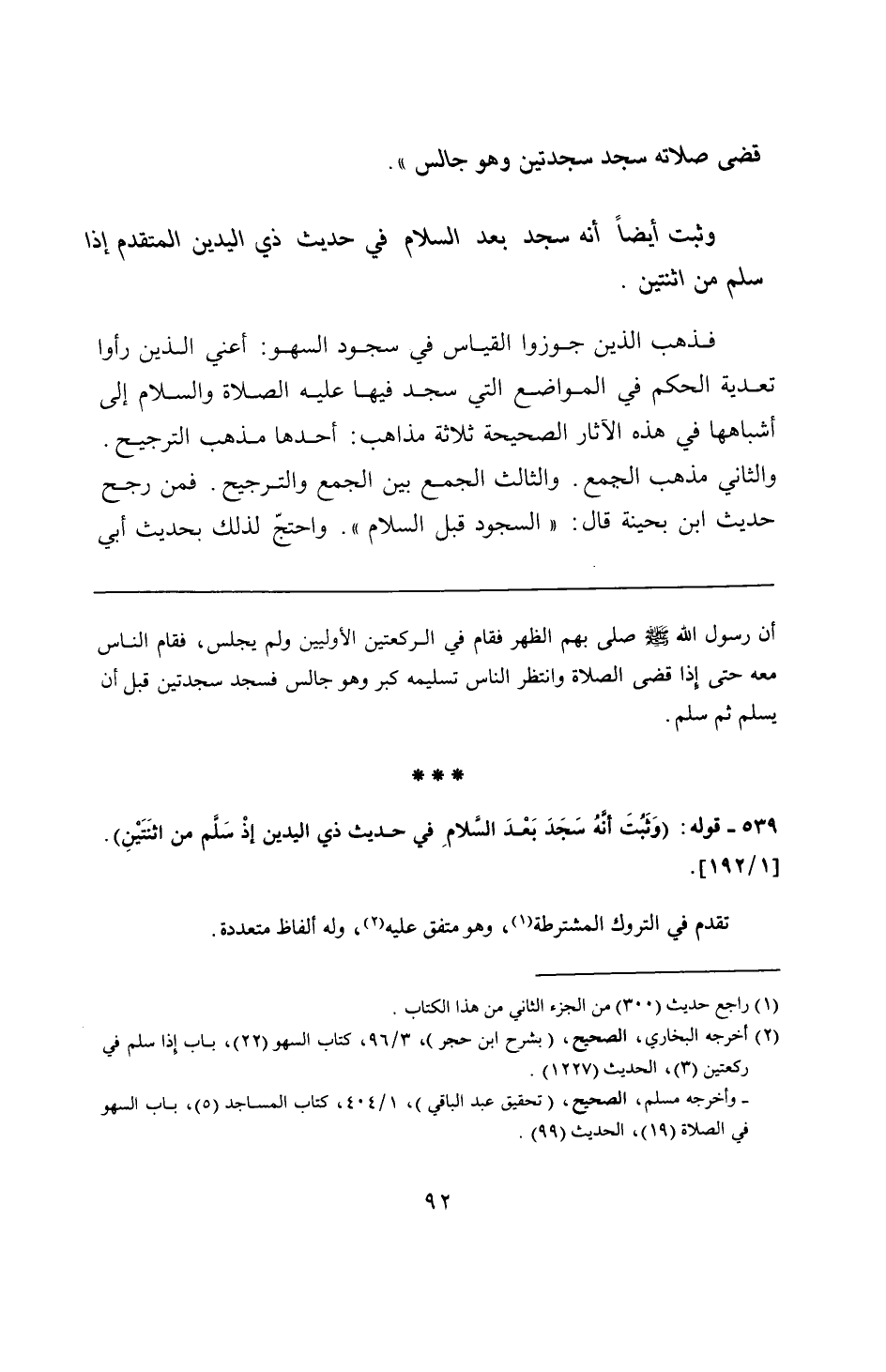 539 - قوله: (وَثَبُتَ أنَّهُ سَجَدَ بَعْدَ السَّلامِ في حديث ذي اليدين إذْ سَلَّم من اثنَتَيْنِ).