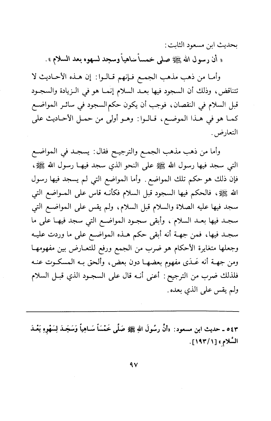 543 - حديث ابن مسعود: "أنَّ رسُولَ اللهِ - صلى الله عليه وسلم - صَلَّى خَمْسًا سَاهِيًا وَسَجَدَ لِسَهْوِهِ بَعْدَ السَّلامِ".