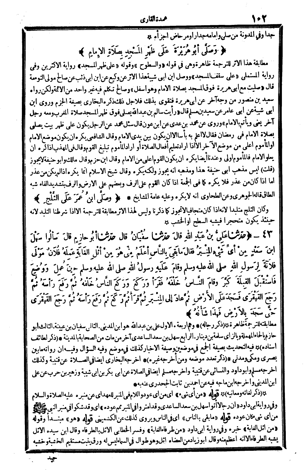 77334 - ح دّثنا عَلِيُّ بنُ عَبْدِ اللَّهِ قالَ حدّثنا سُفْيَانُ قَالَ حدّثنا أبُو حازِمٍ قالَ سَألُوا سَهْلِ بنَ سَعْدٍ مِنْ أيِّ شَيْءٍ الْمِنْبَرُ فقالَ مَا بَقِيَ بِالنَّاسِ أعْلَمُ مِنِّي هُوَ مِنْ أثْلِ الغَابَةِ عَمِلَهُ فُلاَنٌ مَوْلَى فلاَنَةَ لِرَسُولِ الله وقامَ عَلَيْهِ رسولُ اللَّهِ حِينَ عُمِلَ وَوُضِعَ فَاسْتَقْبَلَ القِبلَةَ كَبَّرَ وقامَ النَّاسُ خَلْفَهُ فَقَرَأَ وَرَكَعَ وَرَكَعَ النَّاسُ خَلْفهُ ثُمَّ رَفَعَ رَأسَهُ ثُمَّ رَجَعَ القَهْقَرَى فَسَجَدَ عَلَى الأَرْضِ ثُمَّ عادَ إِلَى المِنْبَرِ ثُمَّ قَرَأَ ثُمَّ رَكَعَ ثُمَّ رَفَعَ رَأسَهُ ثُمَّ رَجَعَ القَهْقَرَى حَتَّى سَجَدَ بِالأَرْضِ فَهَذَا شَأْنُهُ. (الحَدِيث 773 أَطْرَافه فِي: 844، 719، 4902، 9652) .