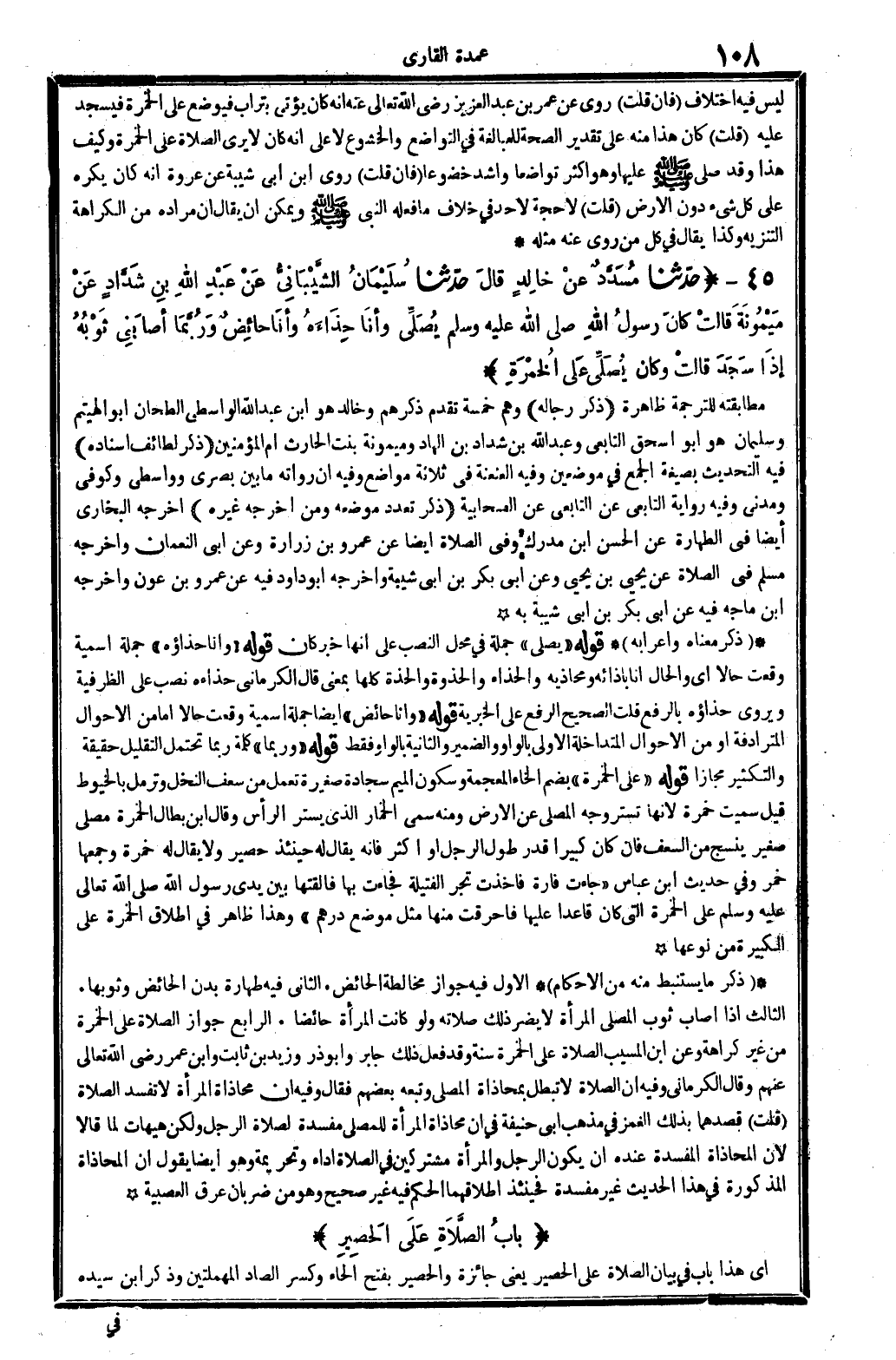 ذكر مَعْنَاهُ وَإِعْرَابه. قَوْله: (يُصَلِّي) جملَة فِي مَحل النصب على أَنَّهَا خبر: كَانَ. قَوْله: (وَأَنا حذاءه) ، جملَة إسمية وَقعت حَالا أَي: وَالْحَال أَنا بإزائه ومحاذيه، والحذاء والحذوة والحذة كلهَا بِمَعْنى. قَالَ الْكرْمَانِي: حذاءه، نصب على الظَّرْفِيَّة، ويروى: حذاؤه، بِالرَّفْع. قلت: الصَّحِيح الرّفْع على الخبرية. قَوْله: (وَأَنا حَائِض) أَيْضا جملَة إسمية وَقعت حَالا إِمَّا من الْأَحْوَال المترادفة أَو من الْأَحْوَال المتداخلة الأولى: بِالْوَاو وَالضَّمِير، وَالثَّانيَِة: بِالْوَاو فَقَط. قَوْله: (وَرُبمَا) كلمة رُبمَا تحْتَمل التقليل حَقِيقَة والتكثير مجَازًا. قَوْله: (على الْخمْرَة) ، بِضَم الْخَاء الْمُعْجَمَة وَسُكُون الْمِيم: سجادة صَغِيرَة تعْمل من سعف النّخل وترمل بالخيوط. قيل: سميت خمرة لِأَنَّهَا تستر وَجه الْمُصَلِّي عَن الأَرْض. وَمِنْه سمي الْخمار الَّذِي يستر الرَّأْس. وَقَالَ ابْن بطال: الْخمْرَة مصلى صَغِير ينسج من السعف، فَإِن كَانَ كَبِيرا قدر طول الرجل أَو أَكثر فَإِنَّهُ يُقَال لَهُ حينئذٍ: حَصِير، وَلَا يُقَال لَهُ خمرة، وَجَمعهَا: خمر. وَفِي حَدِيث ابْن عَبَّاس: (جَاءَت فَأْرَة فَأخذت تجر الفتيلة فَجَاءَت بهَا فألقتها بَين يَدي رَسُول ا، على الْخمْرَة الَّتِي كَانَ قَاعِدا عَلَيْهَا، فأحرقت مِنْهَا مثل مَوضِع دِرْهَم) . وَهَذَا ظَاهر فِي إِطْلَاق الْخمْرَة على الْكَبِيرَة من نوعها.