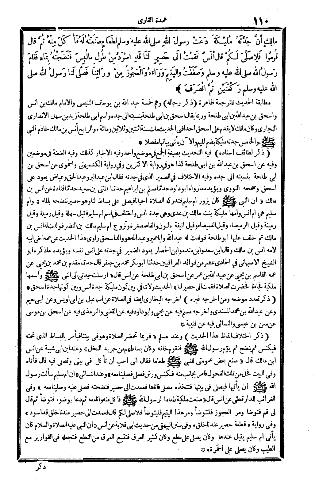 مالِكٍ أنَّ جَدَّتَهُ مُليْكَةَ دَعَتْ رسولَ اللَّهِ لَطَعَامٍ صَنَعَتْهُ لَهُ فَأَكَلَ مِنْهُ ثُمَّ قَالَ: (قُومُوا فَلأضلِّيَ لَكُمْ) قَالَ أنَسٌ فَقمْتُ إلَى حَصِيرٍ لَنَا قَدِ اسْوَدَّ مِنْ طُولِ مَا لُبِسَ فَنَضَحْتُهُ بِمَاءٍ فَقَامَ رَسولُ الله وَصَفَفْتُ واليَتِيمَ وَرَاءَهُ وَالْعَجُوزُ مِنْ وَرَائِنَا فَصَّلَى لَنا رَسولُ الله رَكْعَتَيْنِ ثُمَّ انْصَرَفَ. (الحَدِيث 083 أَطْرَافه فِي: 727، 068، 178، 478، 4611) .