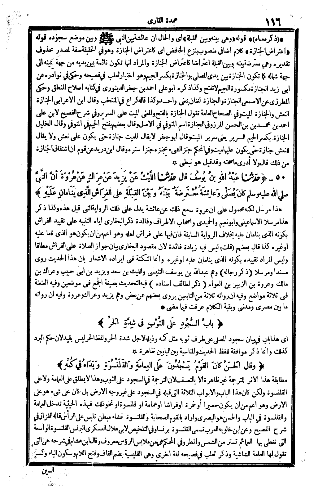 ذكر مَعْنَاهُ: قَوْله: (وَهِي بَينه وَبَين الْقبْلَة) أَي: وَالْحَال أَن عَائِشَة بَين النَّبِي وَبَين مَوضِع سُجُوده. قَوْله: (اعْتِرَاض الْجِنَازَة) ، كَلَام إضافي مَنْصُوب بِنَزْع الْخَافِض، أَي: كاعتراض الْجِنَازَة، وَهُوَ فِي الْحَقِيقَة صفة لمصدر مَحْذُوف تَقْدِيره، وَهِي مُعْتَرضَة بَينه وَبَين الْقبْلَة اعتراضاً كاعتراض الْجِنَازَة. وَالْمرَاد: أَنَّهَا تكون نَائِمَة بَين يَدَيْهِ من جِهَة يَمِينه إِلَى جِهَة شِمَاله، كَمَا تكون الْجِنَازَة بَين يَدي الْمُصَلِّي. والجنازة، بِكَسْر الْجِيم وَهُوَ اخْتِيَار ثَعْلَب فِي (فصيحه) ، وَحكى فِي (نوادره) عَن أبي زيد: الْجِنَازَة، مَكْسُورَة الْجِيم وَلَا تفتح، وَكَذَا ذكره أَبُو عَليّ أَحْمد بن جَعْفَر الدينَوَرِي فِي كِتَابه (إصْلَاح الْمنطق) ، وَحكى المطرزي عَن الْأَصْمَعِي: الْجِنَازَة والجنازة لُغَتَانِ بِمَعْنى وَاحِد، وَكَذَا قَالَه كرَاع فِي (الْمُنْتَخب) وَقَالَ ابْن الْأَعرَابِي: الْجِنَازَة النعش، والجنازة الْمَيِّت. وَفِي (الصِّحَاح) : الْعَامَّة تَقول: الْجِنَازَة، بِالْفَتْح وَالْمعْنَى: الْمَيِّت على السرير، وَفِي (شرح الفصيح) لِابْنِ عَليّ أَحْمد بن مُحَمَّد بن الْحسن المرزوقي: الْجِنَازَة اسْم المتوفي فِي الأَصْل. وَقَالَ بَعضهم، بِفَتْح الْجِيم فِي الْمُتَوفَّى، وَقَالَ الْخَلِيل: الْجِنَازَة بِكَسْر الْجِيم: السرير، يَعْنِي سَرِير الْمَيِّت. وَقَالَ أَبُو جَعْفَر: لَا يُقَال للْمَيت جَنَازَة حَتَّى يكون على نعش، وَلَا يُقَال للنعش جَنَازَة حَتَّى يكون عَلَيْهَا ميت. وَفِي (الْمُحكم) : جنز الشَّيْء يجنزه جنزاً: ستره، وَقَالَ ابْن دُرَيْد عَن قوم: إِن اشتقاق الْجِنَازَة من ذَلِك، قَالَ: وَلَا أَدْرِي مَا صِحَّته، وَقد قيل: هُوَ نبطي.