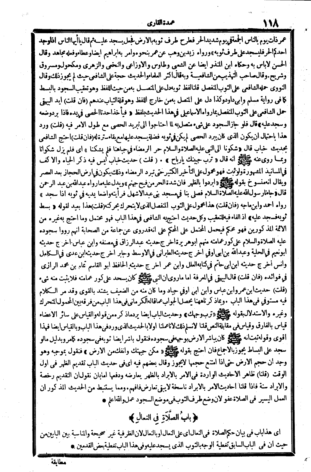 قلت: هَذَا بعيد لقَوْله: (بسط ثَوْبه فَسجدَ عَلَيْهِ) . إِذْ: الْفَاء، فِيهِ للتعقيب. وكل حَدِيث احْتج بِهِ الشَّافِعِي فِي هَذَا الْبَاب فَهُوَ مُحْتَمل، وَمَا احْتج بِهِ غَيره من الْأَئِمَّة الْمَذْكُورين فَهُوَ مُحكم، فَيحمل الْمُحْتَمل على الْمُحكم على أَنه قد رُوِيَ عَن جمَاعَة من الصَّحَابَة أَنهم رووا سُجُوده، عَلَيْهِ الصَّلَاة وَالسَّلَام، على كور عمَامَته. مِنْهُم: أَبُو هُرَيْرَة، أخرج حَدِيثه عبد الرَّزَّاق فِي (مُصَنفه) . وَابْن عَبَّاس، أخرج حَدِيثه أَبُو نعيم فِي (الْحِلْية) . وَعبد ابْن أبي أوفي، أخرج حَدِيثه الطَّبَرَانِيّ فِي (الْأَوْسَط) ، وَجَابِر أخرج حَدِيثه ابْن عدي فِي (الْكَامِل) . وَأنس أخرج حَدِيثه ابْن أبي حَاتِم فِي كِتَابه (الْعِلَل) . وَابْن عمر أخرج حَدِيثه الْحَافِظ أَبُو الْقَاسِم تَمام بن مُحَمَّد الرَّازِيّ فِي (فَوَائده) . فَإِن قلت: قَالَ الْبَيْهَقِيّ فِي (الْمعرفَة) : أما مَا روى أَن النَّبِي كَانَ يسْجد على كور عمَامَته فَلَا يثبت مِنْهُ شَيْء. قلت: حَدِيث ابْن عمر وَابْن عَبَّاس وَابْن أبي أوفى جِيَاد، وَمَا كَانَ مِنْهُ من الضَّعِيف يشْتَد بِالْقَوِيّ، وَقد مر الْكَلَام فِيهِ مُسْتَوفى فِي هَذَا الْبَاب. وَبِمَا ذكرنَا هَهُنَا يحصل الْجَواب عَمَّا قَالَه الْكرْمَانِي فِي هَذَا الْبَاب من فرقه بَين الْمَحْمُول المتحرك وَغَيره، وَالِاسْتِدْلَال بقوله: (ترب وَجهك) ، وَحَدِيث الْبَاب أَيْضا يرد مَا ذكره من قَوْله: وَالْقِيَاس على سَائِر الْأَعْضَاء قِيَاس بالفارق، وَقِيَاس فِي مُقَابلَة النَّص.
