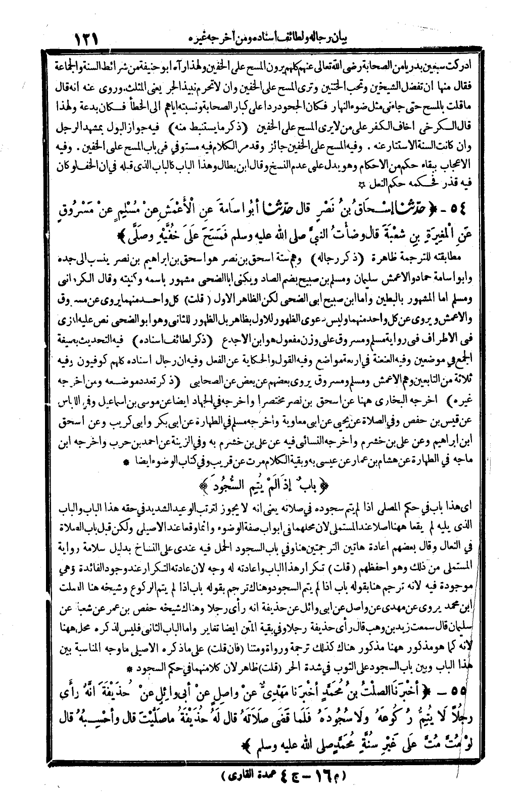 أدْركْت سبعين بَدْرِيًّا من الصَّحَابَة رَضِي اتعالى عَنْهُم، كلهم يرَوْنَ الْمسْح على الْخُفَّيْنِ، وَلِهَذَا رَآهُ أَبُو حنيفَة من شَرَائِط السّنة وَالْجَمَاعَة، فَقَالَ: مِنْهَا أَن تفضل الشَّيْخَيْنِ، وتحب الختنين، وَترى الْمسْح على الْخُفَّيْنِ، وَأَن لَا تحرم نَبِيذ الْجَرّ يَعْنِي المثلث. وَرُوِيَ عَنهُ أَنه قَالَ: مَا قلت بِالْمَسْحِ حَتَّى جَاءَنِي مثل ضوء النَّهَار، فَكَانَ الْجُحُود ردا على كبار الصَّحَابَة، ونسبته إيَّاهُم إِلَى الْخَطَأ فَكَانَ بِدعَة، وَلِهَذَا قَالَ الْكَرْخِي: أَخَاف الْكفْر على من لَا يرى الْمسْح على الْخُفَّيْنِ.