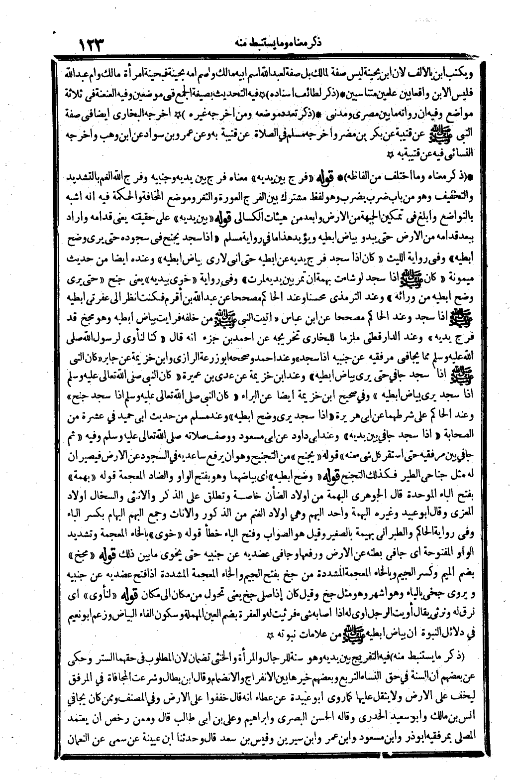 وَيكْتب ابْن بِالْألف لِأَن ابْن بُحَيْنَة لَيْسَ صفة لمَالِك بل صفة لعبد الله اسْم أَبِيه مَالك وَاسم أمه بُحَيْنَة فبحينة امْرَأَة مَالك وَأم عبد الله فَلَيْسَ الابْن وَاقعا بَين علمين متناسبين (ذكر لطائف إِسْنَاده) فِيهِ التحديث بِصِيغَة الْجمع فِي موضِعين وَفِيه العنعنة فِي ثَلَاثَة مَوَاضِع وَفِيه أَن رُوَاته مَا بَين مصري ومدني. (ذكر تعدد مَوْضِعه وَمن أخرجه غَيره) أخرجه البُخَارِيّ أَيْضا فِي صفة النَّبِي - صَلَّى اللَّهُ عَلَيْهِ وَسَلَّم َ - عَن قُتَيْبَة عَن بكر بن مُضر وَأخرجه مُسلم فِي الصَّلَاة عَن قُتَيْبَة بِهِ وَعَن عَمْرو بن سَواد عَن ابْن وهب وَأخرجه النَّسَائِيّ فِيهِ عَن قُتَيْبَة بِهِ (ذكر مَعْنَاهُ وَمَا اخْتلف من أَلْفَاظه) قَوْله " فرج بَين يَدَيْهِ " مَعْنَاهُ فرج بَين يَدَيْهِ وجنبيه وَفرج الله الْغم بِالتَّشْدِيدِ وَالتَّخْفِيف وَهُوَ من بَاب ضرب يضْرب وَهُوَ لفظ مُشْتَرك بَين الْفرج الْعَوْرَة والثغر وَمَوْضِع المخافة وَالْحكمَة فِيهِ أَنه أشبه بالتواضع وأبلغ فِي تَمْكِين الْجَبْهَة من الأَرْض وَأبْعد من هيئات الكسالى قَوْله " بَين يَدَيْهِ " على حَقِيقَته يَعْنِي قدامه وَأَرَادَ يبعد قدامه من الأَرْض حَتَّى يَبْدُو بَيَاض إبطَيْهِ وَيُؤَيّد هَذَا مَا فِي رِوَايَة مُسلم " إِذا سجد يجنح فِي سُجُوده حَتَّى يرى وضح إبطَيْهِ " وَفِي رِوَايَة اللَّيْث " كَانَ إِذا سجد فرج يَدَيْهِ عَن إبطَيْهِ حَتَّى أَنِّي لأرى بَيَاض إبطَيْهِ " وَعِنْده أَيْضا من حَدِيث مَيْمُونَة " كَانَ - صَلَّى اللَّهُ عَلَيْهِ وَسَلَّم َ - إِذا سجد لَو شَاءَت بهمة أَن تمر بَين يَدَيْهِ لمرت " وَفِي رِوَايَة " خوى بيدَيْهِ " يَعْنِي جنح " حَتَّى يرى وضح إبطَيْهِ من وَرَائه " وَعند التِّرْمِذِيّ محسنا وَعند الْحَاكِم مصححا عَن عبد الله بن أقرم فَكنت أنظر إِلَى عفرتي إبطَيْهِ - صَلَّى اللَّهُ عَلَيْهِ وَسَلَّم َ - إِذا سجد وَعند الْحَاكِم مصححا عَن ابْن عَبَّاس " أتيت النَّبِي - صَلَّى اللَّهُ عَلَيْهِ وَسَلَّم َ - من خَلفه فَرَأَيْت بَيَاض إبطَيْهِ وَهُوَ مجخ قد فرج يَدَيْهِ " وَعند الدَّارَقُطْنِيّ ملزما للْبُخَارِيّ تَخْرِيجه عَن أَحْمد بن جُزْء أَنه قَالَ " كُنَّا لنأوي لرَسُول الله - صَلَّى اللَّهُ عَلَيْهِ وَسَلَّم َ - مِمَّا يُجَافِي مرفقيه عَن جَنْبَيْهِ إِذا سجد " وَعند أَحْمد وَصَححهُ أَبُو زرْعَة الرَّازِيّ وَابْن خُزَيْمَة عَن جَابر " كَانَ النَّبِي - صَلَّى اللَّهُ عَلَيْهِ وَسَلَّم َ - إِذا سجد جافى حَتَّى يرى بَيَاض إبطَيْهِ " وَعند ابْن خُزَيْمَة عَن عدي بن عميرَة " كَانَ النَّبِي - صَلَّى اللَّهُ عَلَيْهِ وَسَلَّم َ - إِذا سجد يرى بَيَاض إبطَيْهِ " وَفِي صَحِيح ابْن خُزَيْمَة أَيْضا عَن الْبَراء " كَانَ النَّبِي - صَلَّى اللَّهُ عَلَيْهِ وَسَلَّم َ - إِذا سجد جنح " وَعند الْحَاكِم على شَرطهمَا عَن أبي هُرَيْرَة " إِذا سجد يرى وضح إبطَيْهِ " وَعند مُسلم من حَدِيث أبي حميد فِي عشرَة من الصَّحَابَة " إِذا سجد جافى بَين يَدَيْهِ " وَعند أبي دَاوُد عَن أبي مَسْعُود وَوصف صلَاته - صَلَّى اللَّهُ عَلَيْهِ وَسَلَّم َ - وَفِيه " ثمَّ جافى بَين مرفقيه حَتَّى اسْتَقر كل شَيْء مِنْهُ " قَوْله " يجنح " من التجنيح وَهُوَ أَن يرفع ساعديه فِي السُّجُود عَن الأَرْض فيصيران لَهُ مثل جناحي الطير فَكَذَلِك التجنح قَوْله " وضح إبطَيْهِ " أَي بياضهما وَهُوَ بِفَتْح الْوَاو وَالضَّاد الْمُعْجَمَة قَوْله " بهمة " بِفَتْح الْبَاء الْمُوَحدَة قَالَ الْجَوْهَرِي البهمة من أَوْلَاد الضَّأْن خَاصَّة وَتطلق على الذّكر وَالْأُنْثَى والسخال أَوْلَاد المعزى وَقَالَ أَبُو عبيد وَغَيره البهمة وَاحِد البهم وَهِي أَوْلَاد الْغنم من الذُّكُور وَالْإِنَاث وَجمع البهم البهام بِكَسْر الْبَاء وَفِي رِوَايَة الْحَاكِم وَالطَّبَرَانِيّ بَهِيمَة بالصغير وَقيل هُوَ الصَّوَا