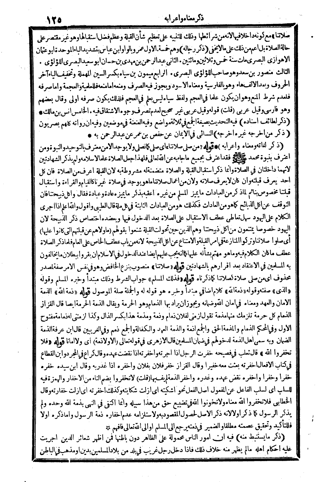 ذكر لغاته وَمَعْنَاهُ وَإِعْرَابه. قَوْله: (من صلى صَلَاتنَا) أَي: صلى كَمَا نصلي، وَلَا يُوجد إلاَّ من معترف بِالتَّوْحِيدِ والنبوة، وَمن اعْترف بنبوة مُحَمَّد فقد اعْترف بِجَمِيعِ مَا جَاءَ بِهِ عَن اتعالى، فَلهَذَا جعل الصَّلَاة علما لإسلامه، وَلم يذكر الشَّهَادَتَيْنِ لِأَنَّهُمَا داخلتان فِي الصَّلَاة، وَإِنَّمَا ذكر اسْتِقْبَال الْقبْلَة وَالصَّلَاة متضمنة لَهُ مَشْرُوطَة بِهِ، لِأَن الْقبْلَة أعرف من الصَّلَاة، فَإِن كل أحد يعرف قبلته وَإِن كَانَ لَا يعرف صلَاته، وَلِأَن من أَعمال صَلَاتنَا مَا هُوَ يُوجد فِي صَلَاة غَيرنَا: كالقيام وَالْقِرَاءَة، واستقبال قبلتنا مَخْصُوص بِنَا، ثمَّ لما ذكر من الْعِبَادَات مَا يُمَيّز الْمُسلم من غَيره أعقبه بِذكر مَا يميزه عَادَة وَعبادَة: فَقَالَ: (وَأكل ذبيحتنا) ، فَإِن التَّوَقُّف عَن أكل الذَّبَائِح كَمَا هُوَ من الْعَادَات، فَكَذَلِك هُوَ من الْعِبَادَات الثَّابِتَة فِي كل مِلَّة. قَالَ الطَّيِّبِيّ: وَأَقُول، وَا أعلم، إِذا أجري الْكَلَام على الْيَهُود سهل تعَاطِي عطف الِاسْتِقْبَال على الصَّلَاة بعد الدُّخُول فِيهَا، ويعضده اخْتِصَاص ذكر الذَّبِيحَة، لِأَن الْيَهُود خُصُوصا يمتنعون من أكل ذبيحتنا، وهم الَّذين حِين تحولت الْقبْلَة شنعوا بقَوْلهمْ: {مَا ولاهم عَن قبلتهم الَّتِي كَانُوا عَلَيْهَا} (الْبَقَرَة: 241) أَي: صلوا صَلَاتنَا وَتركُوا الْمُنَازعَة فِي أَمر الْقبْلَة والامتناع عَن أكل الذَّبِيحَة، لِأَنَّهُ من بَاب عطف الْخَاص على الْعَام، فَلَمَّا ذكر الصَّلَاة عطف مَا كَانَ الْكَلَام فِيهِ وَمَا هُوَ مهتم بِشَأْنِهِ عَلَيْهَا، كَمَا أَنه يجب عَلَيْهِم أَيْضا عِنْد الدُّخُول فِي الْإِسْلَام أَن يقرُّوا بِبُطْلَان مَا يخالفون بِهِ الْمُسلمين فِي الِاعْتِقَاد بعد إقرارهم بِالشَّهَادَتَيْنِ.