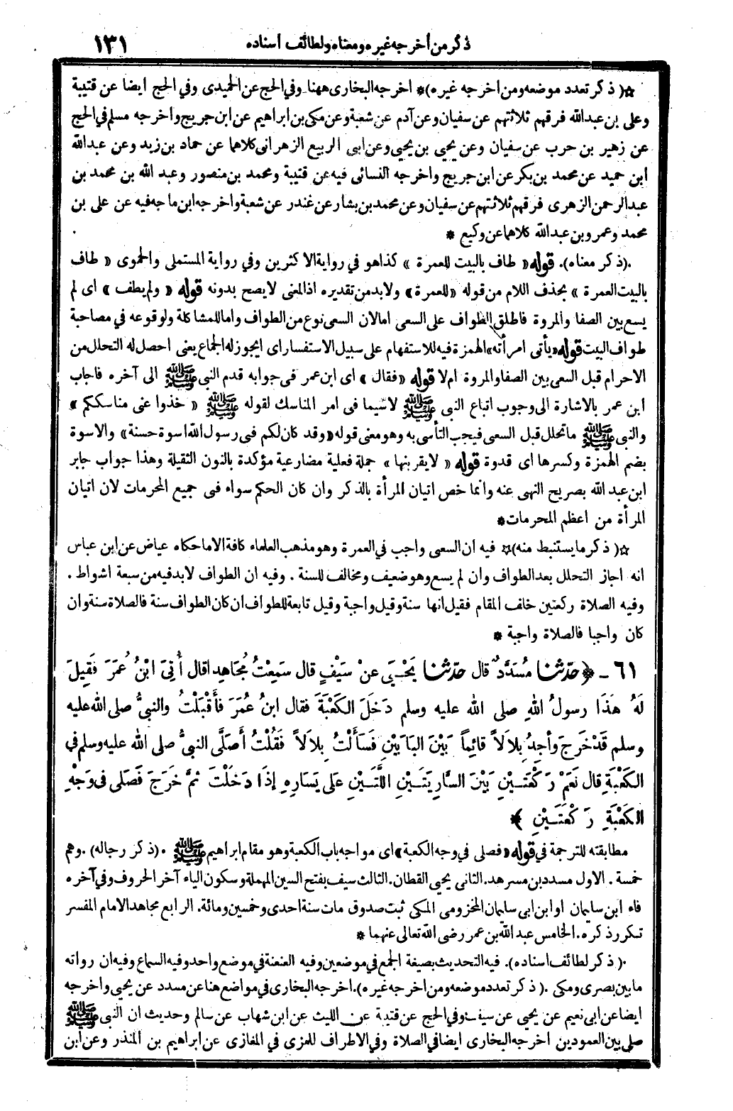 (ذكر تعدد مَوْضِعه وَمن أخرجه غَيره) أخرجه البُخَارِيّ هَهُنَا وَفِي الْحَج عَن الْحميدِي وَفِي الْحَج أَيْضا عَن قُتَيْبَة وَعلي بن عبد الله فرقهم ثَلَاثَتهمْ عَن سُفْيَان وَعَن آدم عَن شُعْبَة وَعَن مكي بن إِبْرَاهِيم عَن ابْن جريج وَأخرجه مُسلم فِي الْحَج عَن زُهَيْر بن حَرْب عَن سُفْيَان وَعَن يحيى بن يحيى وَعَن أبي الرّبيع الزهْرَانِي كِلَاهُمَا عَن حَمَّاد بن زيد وَعَن عبد الله بن حميد عَن مُحَمَّد بن بكر عَن ابْن جريج وَأخرج النَّسَائِيّ فِيهِ عَن قُتَيْبَة وَمُحَمّد بن مَنْصُور وَعبد الله بن مُحَمَّد بن عبد الرَّحْمَن الزُّهْرِيّ فرقهم ثَلَاثَتهمْ عَن سُفْيَان وَعَن مُحَمَّد بن بشار عَن غنْدر عَن شُعْبَة وَأخرجه ابْن مَاجَه فِيهِ عَن عَليّ بن مُحَمَّد وَعَمْرو بن عبد الله كِلَاهُمَا عَن وَكِيع (ذكر مَعْنَاهُ) قَوْله " طَاف بِالْبَيْتِ للْعُمْرَة " كَذَا هُوَ فِي رِوَايَة الْأَكْثَرين وَفِي رِوَايَة الْمُسْتَمْلِي والحموي " طَاف بِالْبَيْتِ للْعُمْرَة " بِحَذْف اللَّام من قَوْله " للْعُمْرَة " وَلَا بُد من تَقْدِيره إِذْ الْمَعْنى لَا يَصح بِدُونِهِ قَوْله " وَلم يطف " أَي لم يسع بَين الصَّفَا والمروة فَأطلق الطّواف على السَّعْي إِمَّا لِأَن السَّعْي نوع من الطّواف وَإِمَّا للمشاكلة ولوقوعه فِي مصاحبة طواف الْبَيْت قَوْله " يَأْتِي امْرَأَته " الْهمزَة فِيهِ للاستفهام على سَبِيل الاستفسار أَي أَيجوزُ لَهُ الْجِمَاع يَعْنِي أحصل لَهُ التَّحَلُّل من الْإِحْرَام قبل السَّعْي بَين الصَّفَا والمروة أم لَا قَوْله " فَقَالَ " أَي ابْن عمر فِي جَوَابه قدم النَّبِي - صَلَّى اللَّهُ عَلَيْهِ وَسَلَّم َ - إِلَى آخِره فَأجَاب ابْن عمر بِالْإِشَارَةِ إِلَى وجوب اتِّبَاع النَّبِي - صَلَّى اللَّهُ عَلَيْهِ وَسَلَّم َ - لَا سِيمَا فِي أَمر الْمَنَاسِك لقَوْله - صَلَّى اللَّهُ عَلَيْهِ وَسَلَّم َ - " خُذُوا عني مَنَاسِككُم " وَالنَّبِيّ - صَلَّى اللَّهُ عَلَيْهِ وَسَلَّم َ - مَا تحلل قبل السَّعْي فَيجب التأسي بِهِ وَهُوَ معنى قَوْله " وَقد كَانَ لكم فِي رَسُول الله أُسْوَة حَسَنَة " والأسوة بِضَم الْهمزَة وَكسرهَا أَي قدوة قَوْله " لَا يقربنها " جملَة فعلية مضارعية مأكدة بالنُّون الثَّقِيلَة وَهَذَا جَوَاب جَابر بن عبد الله بِصَرِيح النَّهْي عَنهُ وَإِنَّمَا خص إتْيَان الْمَرْأَة بِالذكر وَإِن كَانَ الحكم سَوَاء فِي جَمِيع الْمُحرمَات لِأَن إتْيَان الْمَرْأَة من أعظم الْمُحرمَات (ذكر مَا يستنبط مِنْهُ) فِيهِ أَن السَّعْي وَاجِب فِي الْعمرَة وَهُوَ مَذْهَب الْعلمَاء كَافَّة إِلَّا مَا حَكَاهُ عِيَاض عَن ابْن عَبَّاس أَنه أجَاز التَّحَلُّل بعد الطّواف وَإِن لم يسع وَهُوَ ضَعِيف ومخالف للسّنة. وَفِيه أَن الطّواف لَا بُد فِيهِ من سَبْعَة أَشْوَاط. وَفِيه الصَّلَاة رَكْعَتَيْنِ خلف الْمقَام فَقيل أَنَّهَا سنة وَقيل وَاجِبَة وَقيل تَابِعَة للطَّواف إِن كَانَ الطّواف سنة فَالصَّلَاة سنة وَإِن كَانَ وَاجِبا فَالصَّلَاة وَاجِبَة