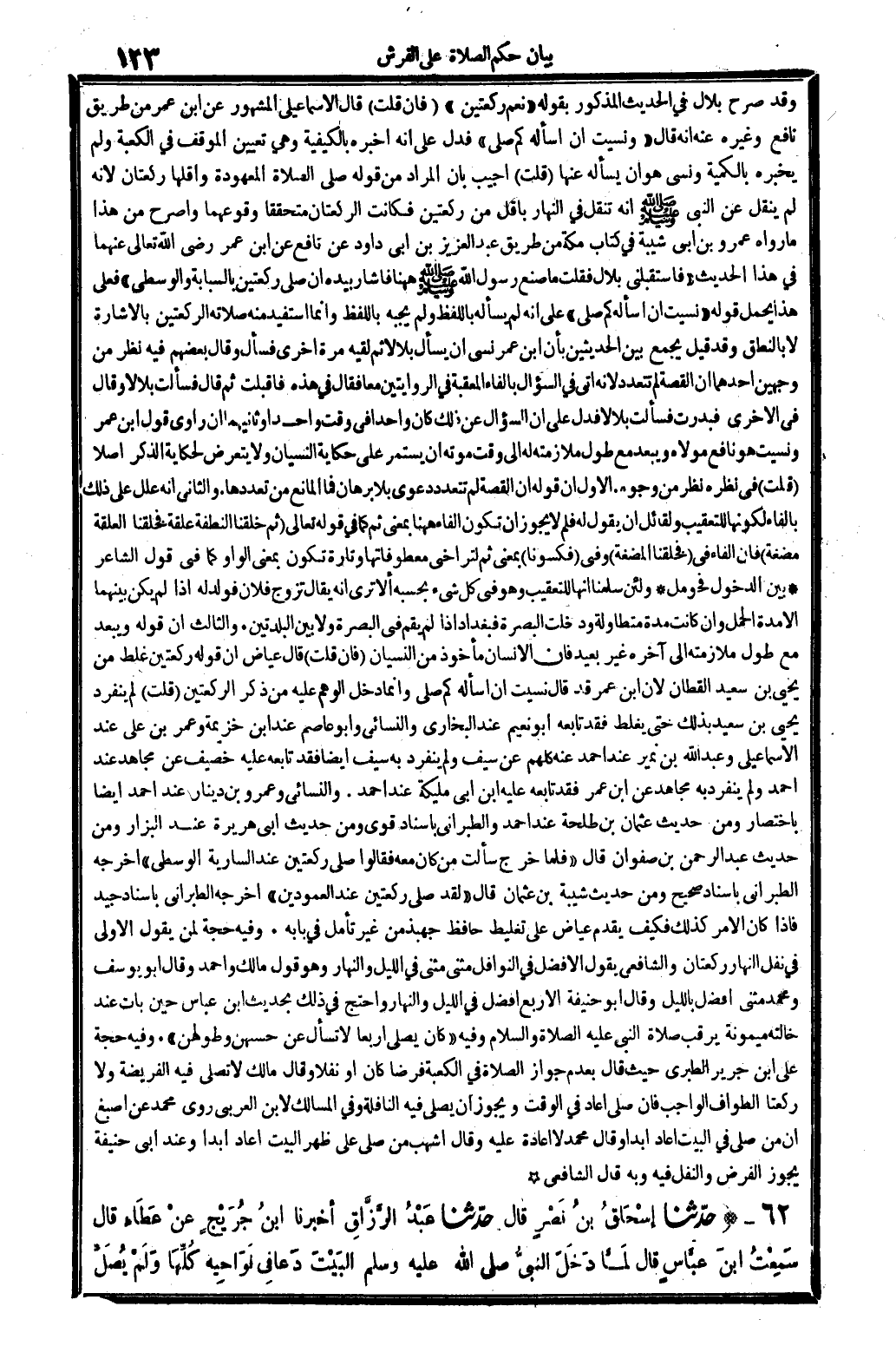 . وَلَئِن سلمنَا أَنَّهَا للتعقيب وَهُوَ فِي كل شَيْء بِحَسبِهِ أَلا ترى أَنه يُقَال تزوج فلَان فولد لَهُ إِذا لم يكن بَينهمَا إِلَّا مُدَّة الْحمل وَإِن كَانَ مُدَّة متطاولة وَدخلت الْبَصْرَة فبغداد إِذا لم يقم فِي الْبَصْرَة وَلَا بَين البلدتين. وَالثَّالِث أَن قَوْله وَيبعد مَعَ طول ملازمته إِلَى آخِره غير بعيد فَإِن الْإِنْسَان مَأْخُوذ من النسْيَان (فَإِن قلت) قَالَ عِيَاض أَن قَوْله رَكْعَتَيْنِ غلط من يحيى بن سعيد الْقطَّان لِأَن ابْن عمر قد قَالَ نسيت أَن أسأله كم صلى وَإِنَّمَا دخل الْوَهم عَلَيْهِ من ذكر الرَّكْعَتَيْنِ (قلت) لم ينْفَرد يحيى بن سعيد بذلك حَتَّى يغلط فقد تَابعه أَبُو نعيم عِنْد البُخَارِيّ وَالنَّسَائِيّ وَأَبُو عَاصِم عِنْد ابْن خُزَيْمَة وَعمر بن عَليّ بن الْإِسْمَاعِيلِيّ وَعبد الله بن نمير عِنْد أَحْمد عَنهُ كلهم عَن سيف وَلم ينْفَرد بِهِ سيف أَيْضا فقد تَابعه عَلَيْهِ خصيف عَن مُجَاهِد عِنْد أَحْمد وَلم ينْفَرد بِهِ مُجَاهِد عَن ابْن عمر فقد تَابعه عَلَيْهِ ابْن أبي مليكَة عِنْد أَحْمد. وَالنَّسَائِيّ وَعَمْرو بن دِينَار عِنْد أَحْمد أَيْضا بِاخْتِصَار وَمن حَدِيث عُثْمَان بن طَلْحَة عِنْد أَحْمد وَالطَّبَرَانِيّ بِإِسْنَاد قوي وَمن حَدِيث أبي هُرَيْرَة عِنْد الْبَزَّار وَمن حَدِيث عبد الرَّحْمَن بن صَفْوَان قَالَ " فَلَمَّا خرج سَأَلت من كَانَ مَعَه فَقَالُوا صلى رَكْعَتَيْنِ عِنْد السارية الْوُسْطَى " أخرجه الطَّبَرَانِيّ بِإِسْنَاد صَحِيح وَمن حَدِيث شيبَة بن عُثْمَان قَالَ " لقد صلى رَكْعَتَيْنِ عِنْد العمودين " أخرجه الطَّبَرَانِيّ بِإِسْنَاد جيد فَإِذا كَانَ الْأَمر كَذَلِك فَكيف يقدم عِيَاض على تغليط حَافظ جهبذ من غير تَأمل فِي بَابه. وَفِيه حجَّة لمن يَقُول الأولى فِي نفل النَّهَار رَكْعَتَانِ وَالشَّافِعِيّ يَقُول الْأَفْضَل فِي النَّوَافِل مثنى مثنى فِي اللَّيْل وَالنَّهَار وَهُوَ قَول مَالك وَأحمد وَقَالَ أَبُو يُوسُف وَمُحَمّد مثنى أفضل بِاللَّيْلِ وَقَالَ أَبُو حنيفَة الْأَرْبَع أفضل فِي اللَّيْل وَالنَّهَار وَاحْتج فِي ذَلِك بِحَدِيث ابْن عَبَّاس حِين بَات عِنْد خَالَته مَيْمُونَة يرقب صَلَاة النَّبِي - صَلَّى اللَّهُ عَلَيْهِ وَسَلَّم َ - وَفِيه " كَانَ يُصَلِّي أَرْبعا لَا تسْأَل عَن حسنهنَّ وطولهن ". وَفِيه حجَّة على ابْن جرير الطَّبَرِيّ حَيْثُ قَالَ بِعَدَمِ جَوَاز الصَّلَاة فِي الْكَعْبَة فرضا كَانَ أَو نفلا وَقَالَ مَالك لَا تصلى فِيهِ الْفَرِيضَة وَلَا رَكعَتَا الطّواف الْوَاجِب فَإِن صلى أعَاد فِي الْوَقْت وَيجوز أَن يُصَلِّي فِيهِ النَّافِلَة وَفِي المسالك لِابْنِ الْعَرَبِيّ روى مُحَمَّد عَن أصبغ أَن من صلى فِي الْبَيْت أعَاد أبدا وَقَالَ مُحَمَّد لَا إِعَادَة عَلَيْهِ وَقَالَ أَشهب من صلى على ظهر الْبَيْت أعَاد أبدا وَعند أبي حنيفَة يجوز الْفَرْض وَالنَّفْل فِيهِ وَبِه قَالَ الشَّافِعِي