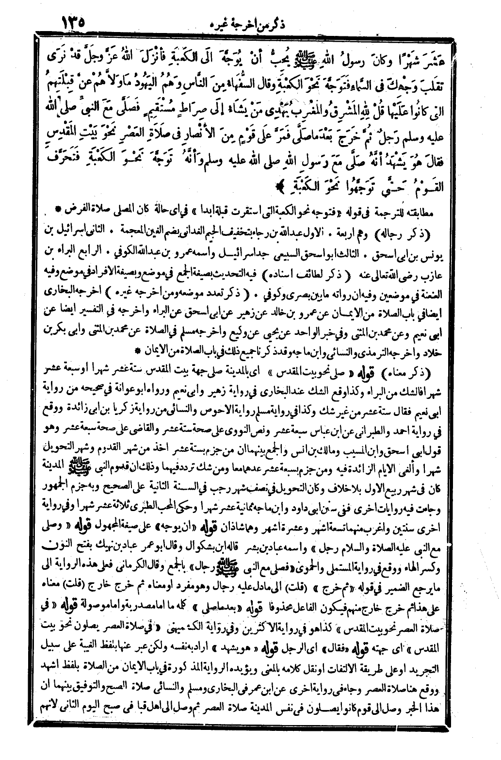 عَشَرَ شَهْراً وكانَ رسولُ اللَّهِ يُحِبُّ أنْ يُوَجَّهَ إِلَى الكَعبَةِ فأنْزَلَ اللَّهُ عَزَّ وجَلَّ قدْ نَرَى تقَلَبَ وَجْهِكَ فِي السَّماءِ فَتَوَجَّهَ نَحْوَ الكعْبَةِ وَقَالَ السُّفَهاءُ مِنَ النَّاسِ وَهُمُ اليَهُودُ مَا وَلاَّهُمْ عنْ قِبْلَتِهمُ الَّتِي كانُوا عَلَيْهَا قُلْ لِلَّهِ المَشْرِقُ والمَغْرِبُ يَهْدِي مَنْ يَشَاءُ إِلَى صِرَاطٍ مُسْتَقِيمٍ فَصَلَّى مَعَ النبيِّ رَجلٌ ثُمَّ خَرَجَ بَعْدَما صَلَّى فَمَرَّ عَلى قَوْمٍ مِنَ الأنْصارِ فِي صَلاَةِ العَصْرِ نَحْوَ بَيْتِ المَقْدِسِ فقالَ هُوَ يَشْهَدُ أنَّهُ صَلَّى مَعَ رَسولِ اللَّهِ وَأنَّهُ تَوَجَّهَ نَحْوَ الكَعْبَةِ فَتَحَرَّفَ القَوْمُ حَتَّى تَوَجَّهُوا نَحْوَ الكَعْبَةِ. .