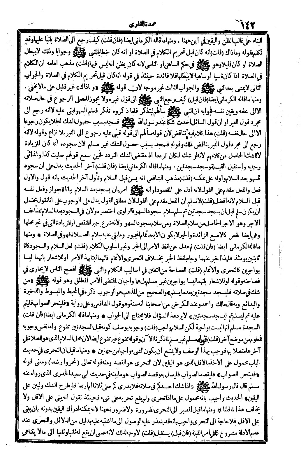 وَمِنْهَا مَا قَالَه الْكرْمَانِي أَيْضا. فَإِن قلت: لم عدل عَن لفظ الْأَمر إِلَى الْخَبَر وَغير أسلوب الْكَلَام؟ قلت: لَعَلَّ السَّلَام وَالسُّجُود كَانَا ثابتين يومئذٍ، فَلهَذَا أخبر عَنْهُمَا، وَجَاء بِلَفْظ الْخَبَر بِخِلَاف التَّحَرِّي والإتمام، فَإِنَّهُمَا ثبتا بِهَذَا الْأَمر، أَو للإشعار بِأَنَّهُمَا ليسَا بواجبين كالتحري والإتمام. قلت: الفصاحة من التفنن فِي أساليب الْكَلَام، وَالنَّبِيّ أفْصح النَّاس لَا يجارى فِي فَصَاحَته، وَقَوله: أَو للإشعار بِأَنَّهُمَا ليسَا بواجبين، غير مُسلم، بل هما واجبان لمقْتَضى الْأَمر الْمُطلق، وَهُوَ قَوْله: (من شكّ فِي صلَاته فليسجد سَجْدَتَيْنِ بَعْدَمَا يسلم) ، وَالصَّحِيح من الْمَذْهَب هُوَ الْوُجُوب، ذكره فِي (الْمُحِيط) و (الْمَبْسُوط) و (الذَّخِيرَة) و (الْبَدَائِع) وَبِه قَالَ مَالك وَأحمد، وَعند الْكَرْخِي من أَصْحَابنَا: أَنه سنة، وَهُوَ قَول الشَّافِعِي. وعَلى رِوَايَة: (فليتحر الصَّوَاب فليتم عَلَيْهِ ثمَّ ليسلم ثمَّ ليسجد سَجْدَتَيْنِ) ، لَا يرد هَذَا السُّؤَال فَلَا يحْتَاج إِلَى الْجَواب.