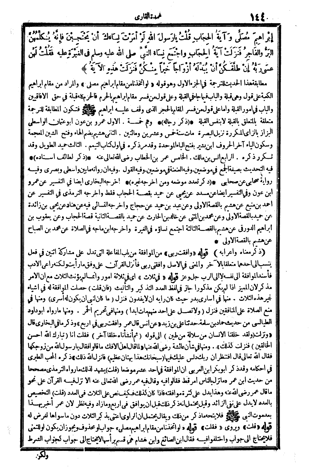 إِبْرَاهِيم مصلى وَآيَة الْحجاب قلت يَا رَسُول الله لَو أمرت نِسَاءَك أَن يحتجبن فَإِنَّهُ يكلمهن الْبر والفاجر فَنزلت آيَة الْحجاب وَاجْتمعَ نسَاء النَّبِي - صَلَّى اللَّهُ عَلَيْهِ وَسَلَّم َ - فِي الْغيرَة عَلَيْهِ فَقلت لَهُنَّ عَسى ربه إِن طَلَّقَكُن أَن يُبدلهُ أَزْوَاجًا خيرا مِنْكُن فَنزلت هَذِه الْآيَة) مُطَابقَة هَذَا الحَدِيث للتَّرْجَمَة فِي الْجُزْء الأول وَهُوَ قَوْله " لَو اتخذنا من مقَام إِبْرَاهِيم مصلى " وَالْمرَاد من مقَام إِبْرَاهِيم الْكَعْبَة على قَول وَهِي قبْلَة وَالْبَاب فِيمَا جَاءَ فِي الْقبْلَة وعَلى قَول من فسر مقَام إِبْرَاهِيم بِالْحرم فالحرم كُله قبْلَة فِي حق الأفاقيين وَالْبَاب فِي أُمُور الْقبْلَة وَأما على قَول من فسر الْمقَام بِالْحجرِ الَّذِي وقف عَلَيْهِ إِبْرَاهِيم صلى الله عَلَيْهِ وَسلم فَتكون الْمُطَابقَة للتَّرْجَمَة مُتَعَلقَة بالمتعلق بالقبلة لَا بِنَفس الْقبْلَة. (ذكر رِجَاله) وهم خَمْسَة. الأول عَمْرو بن عون أَبُو عُثْمَان الوَاسِطِيّ الْبَزَّاز بالزاي المكررة نزيل الْبَصْرَة مَاتَ سنة خمس وَعشْرين وَمِائَتَيْنِ. الثَّانِي هشيم بِضَم الْهَاء وَفتح الشين الْمُعْجَمَة وَسُكُون الْيَاء آخر الْحُرُوف ابْن بشير بِفَتْح الْبَاء الْمُوَحدَة وَقد مر ذكره فِي أول كتاب التَّيَمُّم. الثَّالِث حميد الطَّوِيل وَقد تكَرر ذكره. الرَّابِع أنس بن مَالك. الْخَامِس عمر بن الْخطاب رَضِي الله تَعَالَى عَنهُ. (ذكر لطائف إِسْنَاده) فِيهِ التحديث بِصِيغَة الْجمع فِي موضِعين. وَفِيه العنعنة فِي موضِعين. وَفِيه القَوْل. وَفِيه أَن رُوَاته مَا بَين واسطي وبصري وَفِيه رِوَايَة صَحَابِيّ عَن صَحَابِيّ. (ذكر تعدد مَوْضِعه وَمن أخرجه غَيره) أخرجه البُخَارِيّ أَيْضا فِي التَّفْسِير عَن عَمْرو بن عون وَفِي التَّفْسِير أَيْضا عَن مُسَدّد عَن يحيى عَن حميد بِقصَّة الْحجاب فَقَط وَأخرجه التِّرْمِذِيّ فِي التَّفْسِير عَن أَحْمد بن منيع عَن هشيم بالقصة الأولى وَعَن عبد بن حميد عَن حجاج وَأخرجه النَّسَائِيّ فِيهِ عَن هناد عَن يحيى بن زَائِدَة عَن حميد بالقصة الأولى وَعَن مُحَمَّد بن الْمثنى عَن خَالِد بن الْحَارِث عَن حميد بالقصة الثَّانِيَة قصَّة الْحجاب وَعَن يَعْقُوب بن إِبْرَاهِيم الدَّوْرَقِي عَن هشيم بالقصة الثَّالِثَة اجْتمع نساؤه فِي الْغيرَة وَأخرجه ابْن مَاجَه فِي الصَّلَاة عَن مُحَمَّد بن الصَّباح عَن هشيم بالقصة الأولى. (ذكر مَعْنَاهُ وَإِعْرَابه) قَوْله " وَافَقت رَبِّي " من الْمُوَافقَة من بَاب المفاعلة الَّتِي تدل على مُشَاركَة اثْنَيْنِ فِي فعل ينْسب إِلَى أَحدهمَا مُتَعَلقا بِالْآخرِ وَالْمعْنَى فِي الأَصْل وَافقنِي رَبِّي فَأنْزل الْقُرْآن على وفْق مَا رَأَيْت وَلكنه رَاعى الْأَدَب فأسند الْمُوَافقَة إِلَى نَفسه لَا إِلَى الرب جلّ وَعز قَوْله " فِي ثَلَاث " أَي فِي ثَلَاثَة أُمُور وَإِنَّمَا لم يؤنث الثَّلَاث مَعَ أَن الْأَمر مُذَكّر لِأَن الْمُمَيز إِذا لم يكن مَذْكُورا جَازَ فِي لفظ الْعدَد التَّذْكِير والتأنيث (فَإِن قلت) حصلت الْمُوَافقَة لَهُ فِي أَشْيَاء غير هَذِه الثَّلَاث. مِنْهَا فِي أُسَارَى بدر حَيْثُ كَانَ رَأْيه أَن لَا يفدون فَنزل {مَا كَانَ لنَبِيّ أَن يكون لَهُ أسرى} وَمِنْهَا فِي منع الصَّلَاة على الْمُنَافِقين فَنزل {وَلَا تصل على أحد مِنْهُم مَاتَ أبدا} وَمِنْهَا فِي تَحْرِيم الْخمر. وَمِنْهَا مَا رَوَاهُ أَبُو دَاوُد الطَّيَالِسِيّ من حَدِيث حَمَّاد بن سَلمَة حَدثنَا عَليّ بن زيد " عَن أنس قَالَ عمر وَافَقت رَبِّي فِي أَربع " وَذكر مَا فِي البُخَارِيّ قَالَ " وَنزلت {وَلَقَد خلقنَا الْإِنْسَان من سلالة من طين} إِلَى قَوْله {ثمَّ أَنْشَأْنَاهُ خلقا آخر} فَقلت أَنا {تبَارك الله أحسن الْخَالِقِينَ} فَنزلت كَذَلِك ". وَمِنْهَا فِي شَأْن عَائِشَة رَضِي الله عَنْهَا " لم