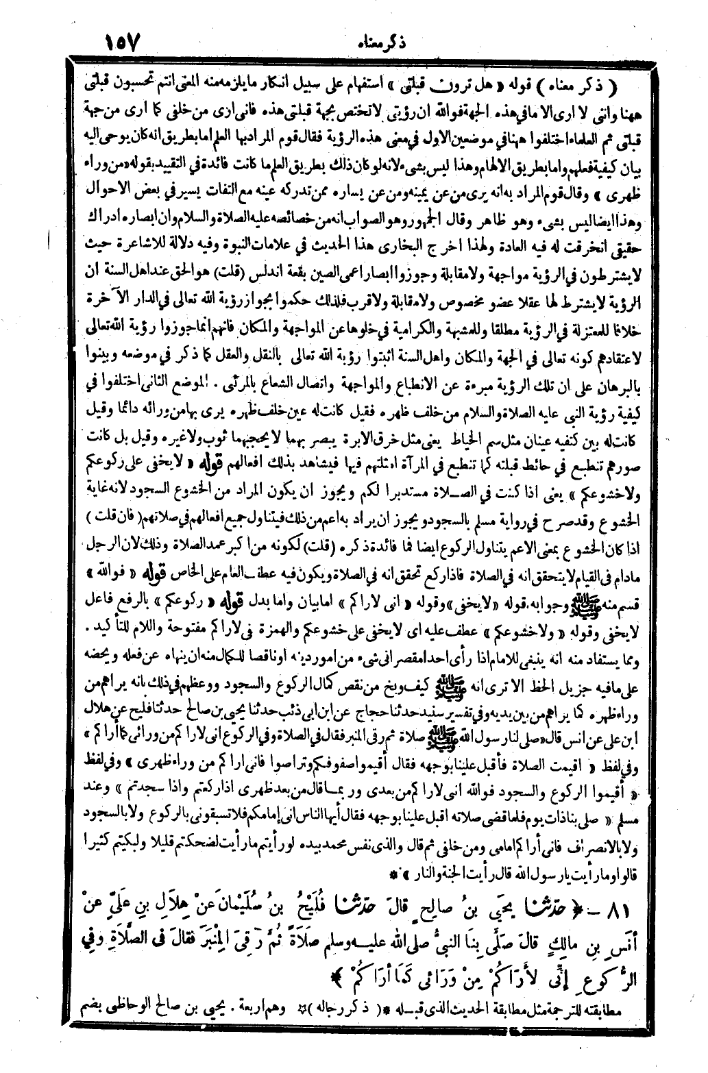 81 - (حَدثنَا يحيى بن صَالح قَالَ حَدثنَا فليح بن سُلَيْمَان عَن هِلَال بن عَليّ عَن أنس بن مَالك قَالَ صلى بِنَا النَّبِي - صَلَّى اللَّهُ عَلَيْهِ وَسَلَّم َ - صَلَاة ثمَّ رقي الْمِنْبَر فَقَالَ فِي الصَّلَاة وَفِي الرُّكُوع إِنِّي لأَرَاكُمْ من ورائي كَمَا أَرَاكُم) مطابقته للتَّرْجَمَة مثل مُطَابقَة الحَدِيث الَّذِي قبله. (ذكر رِجَاله) وهم أَرْبَعَة. يحيى بن صَالح الوحاظي بِضَم