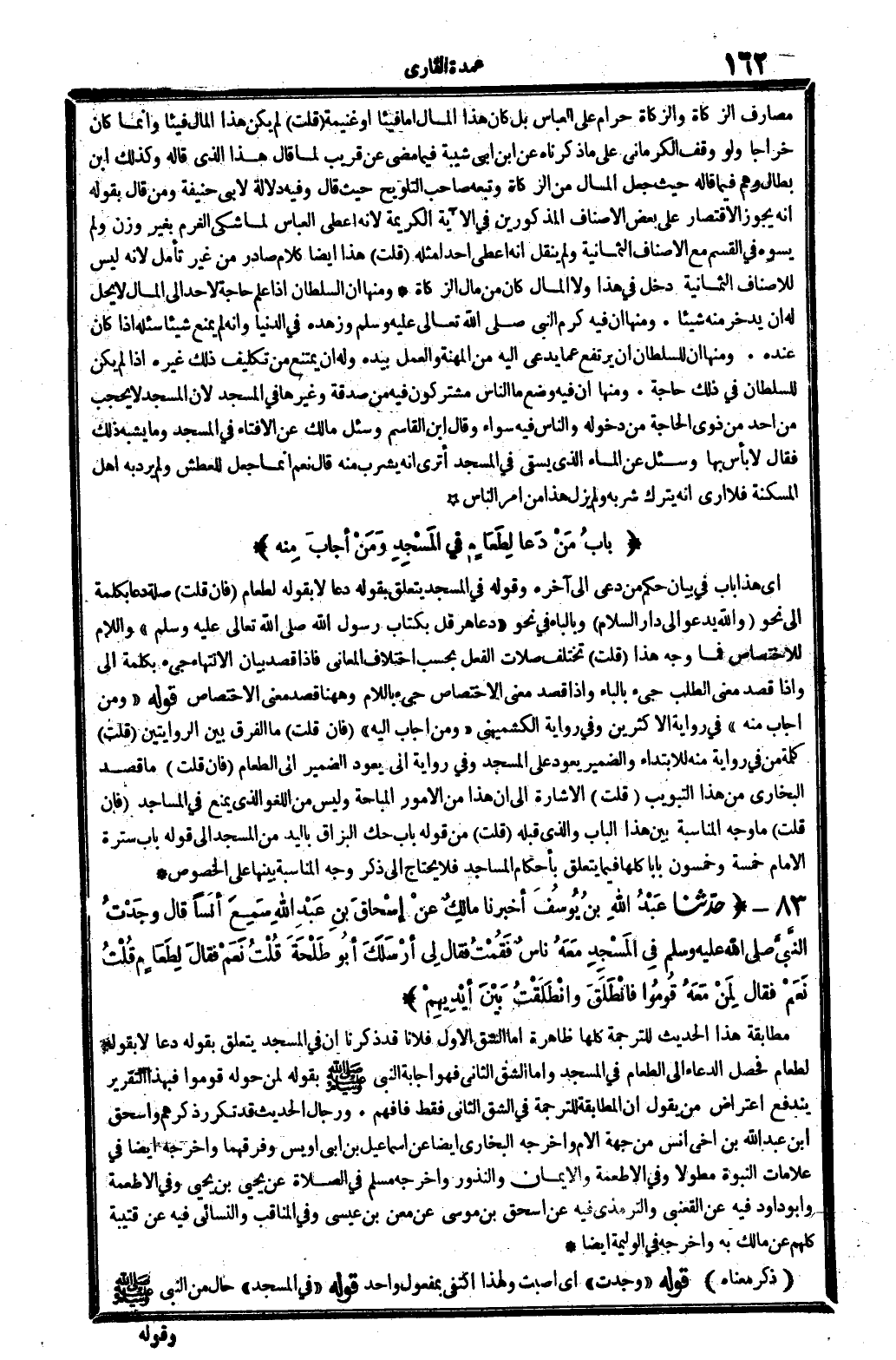 مصارف الزَّكَاة وَالزَّكَاة حرَام على الْعَبَّاس بل كَانَ هَذَا المَال إِمَّا فَيْئا أَو غنيمَة (قلت) لم يكن هَذَا المَال فَيْئا وَإِنَّمَا كَانَ خراجا وَلَو وقف الْكرْمَانِي على مَا ذَكرْنَاهُ عَن ابْن أبي شيبَة فِيمَا مضى عَن قريب لما قَالَ هَذَا الَّذِي قَالَه وَكَذَلِكَ ابْن بطال وهم فِيمَا قَالَه حَيْثُ جعل المَال من الزَّكَاة وَتَبعهُ صَاحب التَّلْوِيح حَيْثُ قَالَ وَفِيه دلَالَة لأبي حنيفَة وَمن قَالَ بقوله أَنه يجوز الِاقْتِصَار على بعض الْأَصْنَاف الْمَذْكُورين فِي الْآيَة الكرمية لِأَنَّهُ أعْطى الْعَبَّاس لما شكى الْغرم بِغَيْر وزن وَلم يسوه فِي الْقسم مَعَ الْأَصْنَاف الثَّمَانِية وَلم ينْقل أَنه أعْطى أحدا مثله (قلت) هَذَا أَيْضا كَلَام صادر من غير تَأمل لِأَنَّهُ لَيْسَ للأصناف الثَّمَانِية دخل فِي هَذَا وَلَا المَال كَانَ من مَال الزَّكَاة وَمِنْهَا أَن السُّلْطَان إِذا علم حَاجَة لأحد إِلَى المَال لَا يحل لَهُ أَن يدّخر مِنْهُ شَيْئا. وَمِنْهَا أَن فِيهِ كرم النَّبِي - صَلَّى اللَّهُ عَلَيْهِ وَسَلَّم َ - وزهده فِي الدُّنْيَا وَأَنه لم يمْنَع شَيْئا سئله إِذا كَانَ عِنْده. وَمِنْهَا أَن للسُّلْطَان أَن يرْتَفع عَمَّا يدعى إِلَيْهِ من المهنة وَالْعَمَل بِيَدِهِ وَله أَن يمْتَنع من تَكْلِيف ذَلِك غَيره إِذا لم يكن للسُّلْطَان فِي ذَلِك حَاجَة. وَمِنْهَا أَن فِيهِ وضع مَا النَّاس مشتركون فِيهِ من صَدَقَة وَغَيرهَا فِي الْمَسْجِد لِأَن الْمَسْجِد لَا يحجب من أحد من ذَوي الْحَاجة من دُخُوله وَالنَّاس فِيهِ سَوَاء وَقَالَ ابْن الْقَاسِم وَسُئِلَ مَالك عَن الافتاء فِي الْمَسْجِد وَمَا يشبه ذَلِك فَقَالَ لَا بَأْس بهَا وَسُئِلَ عَن المَاء الَّذِي يسقى فِي الْمَسْجِد أَتَرَى أَنه يشرب مِنْهُ قَالَ نعم إِنَّمَا جعل للعطش وَلم يرد بِهِ أهل المسكنة فَلَا أرى أَنه يتْرك شربه وَلم يزل هَذَا من أَمر النَّاس
