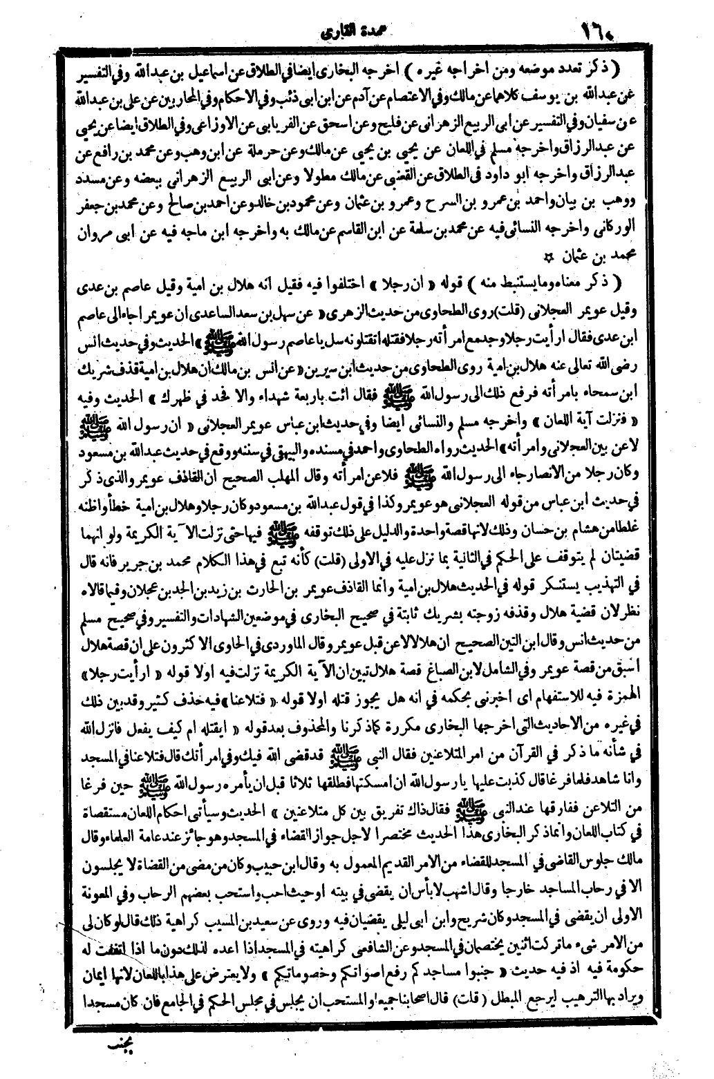 الحَدِيث، وَرَاه الطَّحَاوِيّ وَأحمد فِي (مُسْنده) وَالْبَيْهَقِيّ فِي (سنَنه) وَوَقع فِي حَدِيث عبد اللَّه بن مَسْعُود: وَكَانَ رجلا من الْأَنْصَار جَاءَ إِلَى رَسُول الله فلاعن امْرَأَته. وَقَالَ الْمُهلب: الصَّحِيح أَن الْقَاذِف: عُوَيْمِر، وَالَّذِي ذكر فِي حَدِيث ابْن عَبَّاس من قَوْله الْعجْلَاني هُوَ عُوَيْمِر، وَكَذَا فِي قَول عبد اللَّه بن مَسْعُود، وَكَانَ رجلا، وهلال بن أُميَّة خطأ، وَأَظنهُ غَلطا من هِشَام بن حسان، وَذَلِكَ لِأَنَّهَا قصَّة وَاحِدَة، وَالدَّلِيل على ذَلِك توقفه فِيهَا حَتَّى نزلت الْآيَة الْكَرِيمَة، وَلَو أَنَّهُمَا قضيتان لم يتَوَقَّف على الحكم فِي الثَّانِيَة بِمَا نزل عَلَيْهِ فِي الأولى. قلت: كَأَنَّهُ تبع فِي هَذَا الْكَلَام مُحَمَّد بن جرير، فَإِنَّهُ قَالَ فِي (التَّهْذِيب) : يستنكر قَوْله فِي الحَدِيث: هِلَال بن أُميَّة، وَإِنَّمَا الْقَاذِف عُوَيْمِر بن الْحَارِث بن زيد بن الْجد بن عجلَان. وَفِيمَا قَالَاه نظر لِأَن قَضِيَّة هِلَال وقذفه زَوجته بِشريك ثَابِتَة فِي صَحِيح البُخَارِيّ فِي موضِعين: الشَّهَادَات وَالتَّفْسِير وَفِي صَحِيح مُسلم من حَدِيث أنس. وَقَالَ ابْن التِّين: الصَّحِيح أَن هلالاً لَا عَن قبل عُوَيْمِر، وَقَالَ الْمَاوَرْدِيّ فِي الْحَاوِي. الْأَكْثَرُونَ على أَن قصَّة هِلَال أسبق من قصَّة عُوَيْمِر، وَفِي (الشَّامِل) لِابْنِ الصّباغ قصَّة هِلَال، تبين أَن الْآيَة الْكَرِيمَة نزلت فِيهِ أَولا.