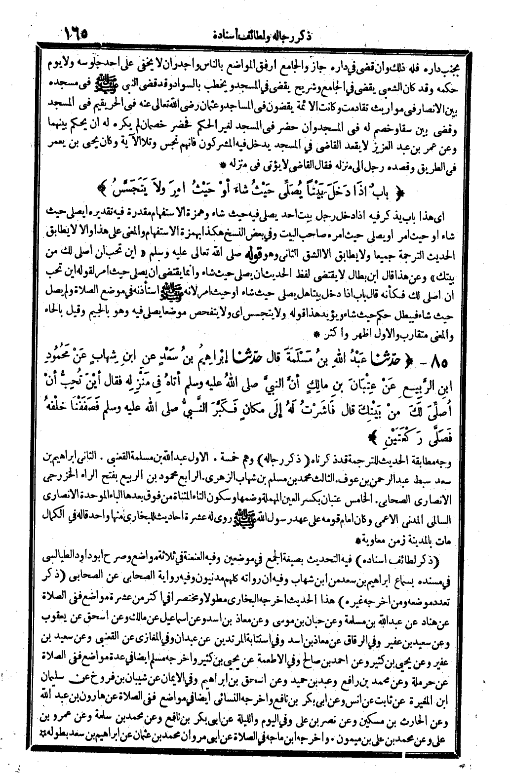 85 - (حَدثنَا عبد الله بن مسلمة قَالَ حَدثنَا إِبْرَاهِيم بن سعد عَن ابْن شهَاب عَن مَحْمُود بن الرّبيع عَن عتْبَان بن مَالك أَن النَّبِي - صَلَّى اللَّهُ عَلَيْهِ وَسَلَّم َ - أَتَاهُ فِي منزله فَقَالَ أَيْن تحب أَن أُصَلِّي لَك من بَيْتك قَالَ فأشرت لَهُ إِلَى مَكَان فَكبر النَّبِي - صَلَّى اللَّهُ عَلَيْهِ وَسَلَّم َ - فصففنا خَلفه فصلى رَكْعَتَيْنِ) وَجه مُطَابقَة الحَدِيث للتَّرْجَمَة قد ذَكرْنَاهُ (ذكر رِجَاله) وهم خَمْسَة. الأول عبد الله بن مسلمة القعْنبِي. الثَّانِي إِبْرَاهِيم بن سعد سبط عبد الرَّحْمَن بن عَوْف. الثَّالِث مُحَمَّد بن مُسلم بن شهَاب الزُّهْرِيّ. الرَّابِع مَحْمُود بن الرّبيع بِفَتْح الرَّاء الخزرجي الْأنْصَارِيّ الصَّحَابِيّ. الْخَامِس عتْبَان بِكَسْر الْعين الْمُهْملَة وَضمّهَا وَسُكُون التَّاء الْمُثَنَّاة من فَوق بعْدهَا الْبَاء الْمُوَحدَة الْأنْصَارِيّ السالمي الْمدنِي الْأَعْمَى وَكَانَ إِمَام قومه على عهد رَسُول الله - صَلَّى اللَّهُ عَلَيْهِ وَسَلَّم َ - رُوِيَ لَهُ عشرَة أَحَادِيث للْبُخَارِيّ مِنْهَا وَاحِد قَالَه فِي الْكَمَال مَاتَ بِالْمَدِينَةِ زمن مُعَاوِيَة. (ذكر لطائف إِسْنَاده) فِيهِ التحديث بِصِيغَة الْجمع فِي موضِعين وَفِيه العنعنة فِي ثَلَاثَة مَوَاضِع وَصرح أَبُو دَاوُد الطَّيَالِسِيّ فِي مُسْنده بِسَمَاع إِبْرَاهِيم بن سعد من ابْن شهَاب وَفِيه أَن رُوَاته كلهم مدنيون وَفِيه رِوَايَة الصَّحَابِيّ عَن الصَّحَابِيّ. (ذكر تعدد مَوْضِعه وَمن أخرجه غَيره) هَذَا الحَدِيث أخرجه البُخَارِيّ مطولا ومختصرا فِي أَكثر من عشرَة مَوَاضِع فَفِي الصَّلَاة عَن هناد عَن عبد الله بن مسلمة وَعَن حبَان بن مُوسَى وَعَن معَاذ بن أَسد وَعَن إِسْمَاعِيل عَن مَالك وَعَن اسحق عَن يَعْقُوب وَعَن سعيد بن عفير وَفِي الرقَاق عَن معَاذ بن أَسد وَفِي اسْتِتَابَة الْمُرْتَدين عَن عَبْدَانِ وَفِي الْمَغَازِي عَن القعْنبِي وَعَن سعيد بن عفير وَعَن يحيى بن كثير وَعَن أَحْمد بن صَالح وَفِي الْأَطْعِمَة عَن يحيى بن كثير وَأخرجه مُسلم أَيْضا فِي عدَّة مَوَاضِع فَفِي الصَّلَاة عَن حَرْمَلَة وَعَن مُحَمَّد بن رَافع وَعبد بن حميد وَعَن اسحق بن إِبْرَاهِيم وَفِي الْإِيمَان عَن شَيبَان بن فروخ عَن سُلَيْمَان بن الْمُغيرَة عَن ثَابت عَن أنس وَعَن أبي بكر بن نَافِع وَأخرجه النَّسَائِيّ أَيْضا فِي مَوَاضِع فَفِي الصَّلَاة عَن هَارُون بن عبد الله وَعَن الْحَارِث بن مِسْكين وَعَن نصر بن عَليّ وَفِي الْيَوْم وَاللَّيْلَة عَن أبي بكر بن نَافِع وَعَن مُحَمَّد بن سَلمَة وَعَن عَمْرو بن عَليّ وَعَن مُحَمَّد بن عَليّ بن مَيْمُون. وَأخرجه ابْن مَاجَه فِي الصَّلَاة عَن أبي مَرْوَان مُحَمَّد بن عُثْمَان عَن إِبْرَاهِيم بن سعد بِطُولِهِ