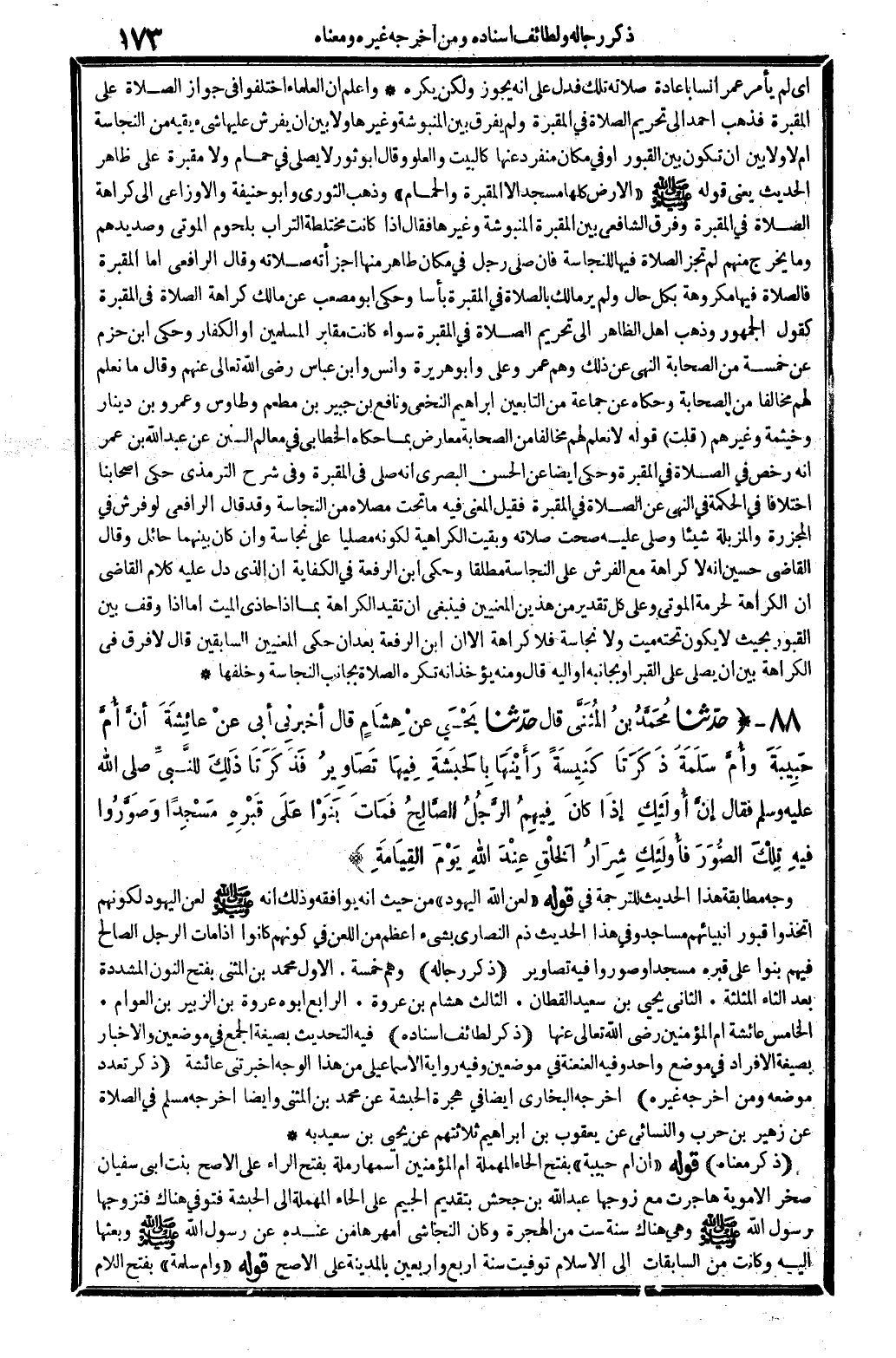 72488 - حدّثنا مُحَمَّدُ بنُ المُثَنَّى قَالَ حدّثنا يَحْيَى عنْ هِشَامٍ قَالَ أخبرنِي أبي عنْ عائِشَةَ أنَّ أُمَّ حَبِيبَةَ وأُمَّ سَلَمَةَ ذَكَرَتَا كَنِيسَةً رَأَيْنَهَا بِالحَبَشَةِ فِيهَا تَصَاوِيرُ فَذَكَرَتَا ذَلِكَ للنَّبيِّ فَقَالَ إنَّ أُولَئِكِ إذَا كانَ فِيهِمُ الرَّجُلُ الصَّالِحُ فَمَاتَ بَنَوْا عَلَى قَبْرِهِ مَسْجِداً وَصَوَّرُوا فيهِ تَلْكَ الصُّوَرَ فأُولَئِكِ شِرَارُ الخَلْقِ عِنْدَ ايَوْمَ القِيَامَةِ. (الحَدِيث 724 أَطْرَافه فِي: 434، 1431، 8783) .