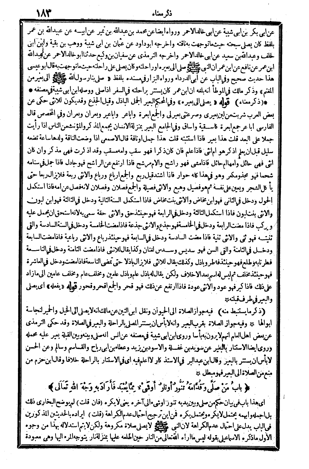 عَن أبي بكر بن أبي شيبَة عَن أبي خَالِد الْأَحْمَر وَرَوَاهُ أَيْضا عَن مُحَمَّد بن عبد الله بن نمير عَن أَبِيه عَن عبيد الله بن عمر بِلَفْظ كَانَ يُصَلِّي سبحته حَيْثُ مَا تَوَجَّهت نَاقَته وَأخرجه أَبُو دَاوُد عَن عُثْمَان بن أبي شيبَة ووهب بن بَقِيَّة وَابْن أبي خلف وَعبد الله بن سعيد عَن أبي خَالِد الْأَحْمَر وَأخرجه التِّرْمِذِيّ عَن سُفْيَان بن وَكِيع حَدثنَا أَبُو خَالِد الْأَحْمَر عَن عبد الله بن عمر عَن نَافِع عَن ابْن عمر أَن النَّبِي - صَلَّى اللَّهُ عَلَيْهِ وَسَلَّم َ - صلى إِلَى بعيره أَو رَاحِلَته وَكَانَ يُصَلِّي على رَاحِلَته حَيْثُ مَا تَوَجَّهت بِهِ قَالَ أَبُو عِيسَى هَذَا حَدِيث صَحِيح وَفِي الْبَاب عَن أبي الدَّرْدَاء وَرَوَاهُ الْبَزَّار فِي مُسْنده بِلَفْظ " صلى بِنَا رَسُول الله - صَلَّى اللَّهُ عَلَيْهِ وَسَلَّم َ - إِلَى بعير من الْمغنم " وَذكر مَالك فِي الْمُوَطَّأ أَنه بلغه أَن ابْن عمر كَانَ يسْتَتر براحلته فِي السّفر إِذا صلى وَوَصله ابْن أبي شيبَة فِي مُصَنفه (ذكر مَعْنَاهُ) قَوْله " يُصَلِّي إِلَى بعيره " وَفِي الْمُحكم الْبَعِير الْجمل الْبَاذِل وَقيل الْجذع وَقد يكون للْأُنْثَى حكى عَن بعض الْعَرَب شربت من لبن بَعِيري وصرعتني بعير لي وَالْجمع أَبْعِرَة وأباعر وأباعير وبعران وبعران وَفِي الْمُخَصّص قَالَ الْفَارِسِي أباعر جمع أَبْعِرَة كأسقية وأساق وَفِي الْجَامِع الْبَعِير بِمَنْزِلَة الْإِنْسَان يجمع الْمُذكر والمؤنث من النَّاس إِذا رَأَيْت جملا على الْبعد قلت هَذَا بعير فَإِذا استثبته قلت هَذَا جمل أَو نَاقَة قَالَ الْأَصْمَعِي إِذا وضعت النَّاقة وَلَدهَا سَاعَة تضعه سليل قبل أَن يعلم أذكر هُوَ أم أُنْثَى فَإِذا علم فَإِن كَانَ ذكرا فَهُوَ سقب وَأمه مسقب وَقد أذكرت فَهِيَ مُذَكّر وَإِن كَانَ أُنْثَى فَهِيَ حَائِل وَأمّهَا أم حَائِل فَإِذا مَشى فَهُوَ راشح وَالأُم مرشح فَإِذا ارْتَفع عَن الراشح فَهُوَ جادل فَإِذا جمل فِي سنامه شحما فَهُوَ مجذومكعر وَهُوَ فِي هَذَا كُله حوار فَإِذا اشْتَدَّ قيل ربع وَالْجمع أَربَاع وَربَاع وَالْأُنْثَى ربعَة فَلَا يزَال ربعا حَتَّى يَأْكُل الشّجر ويعين على نَفسه ثمَّ هُوَ فصيل وهبع وَالْأُنْثَى فصيلة وَالْجمع فصلان وفصلان لِأَنَّهُ فصل عَن أمه فَإِذا اسْتكْمل الْحول وَدخل فِي الثَّانِي فَهُوَ ابْن مَخَاض وَالْأُنْثَى بنت مَخَاض فَإِذا اسْتكْمل السّنة الثَّانِيَة وَدخل فِي الثَّالِثَة فَهُوَ ابْن لبون وَالْأُنْثَى بنت لبون فَإِذا اسْتكْمل الثَّالِثَة وَدخل فِي الرَّابِعَة فَهُوَ حِينَئِذٍ حق وَالْأُنْثَى حقة سمي بِهِ لِأَنَّهُ اسْتحق أَن يحمل عَلَيْهِ ويركب فَإِذا مَضَت الرَّابِعَة وَدخل فِي الْخَامِسَة فَهُوَ جذع وَالْأُنْثَى جَذَعَة فَإِذا مَضَت الْخَامِسَة وَدخل فِي السّنة السَّادِسَة وَألقى ثنيته فَهُوَ ثني وَالْأُنْثَى ثنية فَإِذا مَضَت السَّادِسَة وَدخل فِي السَّابِعَة فَهُوَ حِينَئِذٍ رباع وَالْأُنْثَى ربَاعِية فَإِذا مَضَت السَّابِعَة وَدخل فِي الثَّامِنَة وَألقى السن فَهُوَ سديس وَسدس لُغَتَانِ وَكَذَا يُقَال للْأُنْثَى فَإِذا مَضَت الثَّامِنَة وَدخل فِي التَّاسِعَة فطرنا بِهِ وطلع فَهُوَ حِينَئِذٍ فاطر وباذل وَكَذَلِكَ يُقَال للْأُنْثَى فَلَا يزَال باذلا حَتَّى تمْضِي التَّاسِعَة فَإِذا مَضَت وَدخل فِي الْعَاشِرَة فَهُوَ حِينَئِذٍ مخلف ثمَّ لَيْسَ لَهُ اسْم بعد الإخلاف وَلَكِن يُقَال لَهُ باذل عَام وباذل عَاميْنِ ومخلف عَام ومخلف عَاميْنِ إِلَى مَا زَاد على ذَلِك فَإِذا كبر فَهُوَ عود وَالْأُنْثَى عودة فَإِذا ارْتَفع عَن ذَلِك فَهُوَ قحر وَالْجمع أقحر وقحور قَوْله " يَفْعَله " أَي يُصَلِّي وَالْبَعِير فِي طرف قبلته (ذكر مَا يستنبط مِنْهُ) فِيهِ جَوَاز الصَّلَاة إِلَى الْحَيَوَان وَنقل ابْن التِّين عَن مَالك أَنه لَا يصلى 