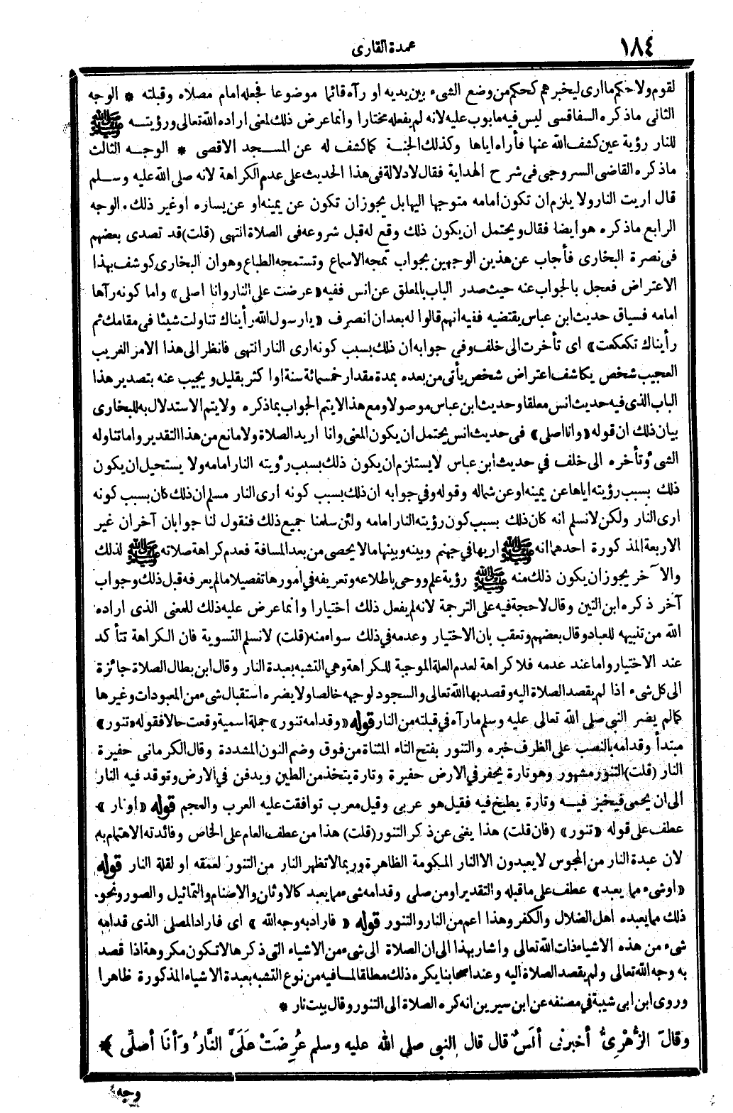 فَانْظُر إِلَى هَذَا الْأَمر الْغَرِيب العجيب، شخص يكاشف اعْتِرَاض شخص يَأْتِي من بعده بِمدَّة مِقْدَار خَمْسمِائَة سنة أَو أَكثر بِقَلِيل، ويجيب عَنهُ بتصدير هَذَا الْبَاب الَّذِي فِيهِ حَدِيث أنس مُعَلّقا، وَحَدِيث ابْن عَبَّاس مَوْصُولا، وَمَعَ هَذَا لَا يتم الْجَواب بِمَا ذكره، وَلَا يتم الِاسْتِدْلَال بِهِ للْبُخَارِيّ. بَيَان ذَلِك أَن قَوْله: (وَأَنا أُصَلِّي) ، فِي حَدِيث أنس، يحْتَمل أَن يكون الْمَعْنى: وَأَنا أُرِيد الصَّلَاة، وَلَا مَانع من هَذَا التَّقْدِير. وَأما تنَاوله الشَّيْء وتأخره إِلَى خلف فِي حَدِيث ابْن عَبَّاس لَا يسْتَلْزم أَن يكون ذَلِك بِسَبَب رُؤْيَته النَّار أَمَامه، وَلَا يَسْتَحِيل أَن يكون ذَلِك بِسَبَب رُؤْيَته إِيَّاهَا عَن يَمِينه أَو عَن شِمَاله. وَقَوله وَفِي جَوَابه: إِن ذَلِك بِسَبَب كَونه أرِي النَّار، مُسلم إِن ذَلِك كَانَ بِسَبَب كَونه أرِي النَّار، وَلَكِن لَا نسلم أَنه كَانَ ذَلِك بِسَبَب كَون رُؤْيَته النَّار أَمَامه، وَلَئِن سلمنَا جَمِيع ذَلِك فَنَقُول: لنا جوابان آخرَانِ غير الْأَرْبَعَة الْمَذْكُورَة: