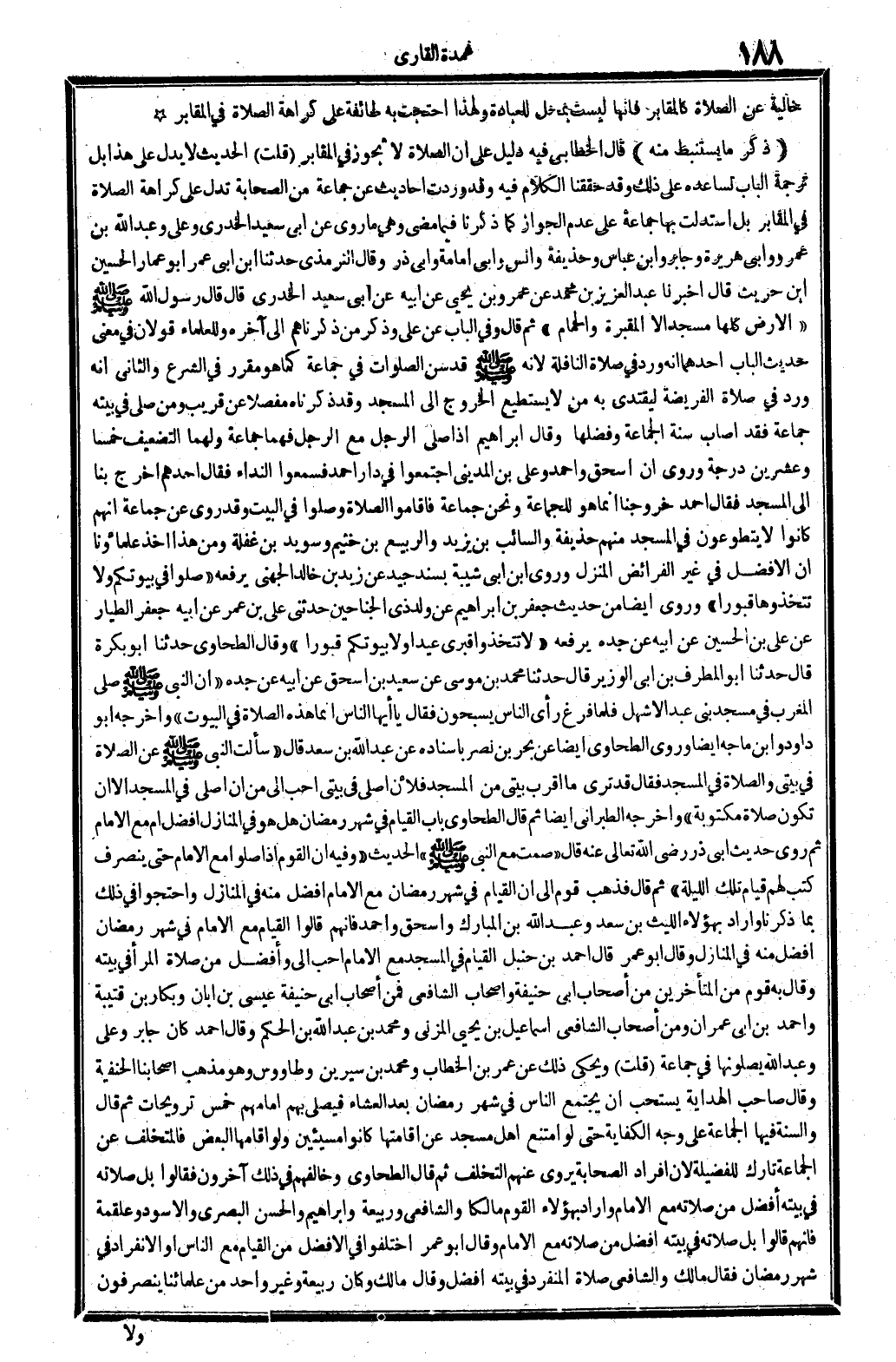 الحَدِيث وَفِيه: (إِن الْقَوْم إِذا صلوا مَعَ الإِمَام حَتَّى ينْصَرف كتب لَهُم قيام تِلْكَ اللَّيْلَة) . ثمَّ قَالَ: فَذهب قوم إِلَى أَن الْقيام فِي شهر رَمَضَان مَعَ الإِمَام أفضل مِنْهُ فِي الْمنَازل، وَاحْتَجُّوا فِي ذَلِك بِمَا ذكرنَا، وَأَرَادَ بهؤلاء: اللَّيْث بن سعد وَعبد اللَّه بن الْمُبَارك وَإِسْحَاق وَأحمد فَإِنَّهُم قَالُوا: الْقيام مَعَ الإِمَام فِي شهر رَمَضَان أفضل مِنْهُ فِي الْمنَازل. وَقَالَ أَبُو عمر: قَالَ أَحْمد بن حَنْبَل: الْقيام فِي الْمَسْجِد مَعَ الإِمَام أحب إِلَيّ وَأفضل من صَلَاة المرأ فِي بَيته. وَقَالَ بِهِ قوم من الْمُتَأَخِّرين من أَصْحَاب أبي حنيفَة وَأَصْحَاب الشَّافِعِي، فَمن أَصْحَاب أبي حنيفَة: عِيسَى بن أبان وبكار بن قُتَيْبَة وَأحمد بن أبي عمرَان. وَمن أَصْحَاب الشَّافِعِي: إِسْمَاعِيل بن يحيى الْمُزنِيّ وَمُحَمّد بن عبد اللَّه بن الحكم. وَقَالَ أَحْمد: كَانَ جَابر وَعلي وَعبد اللَّه يصلونها فِي جمَاعَة.