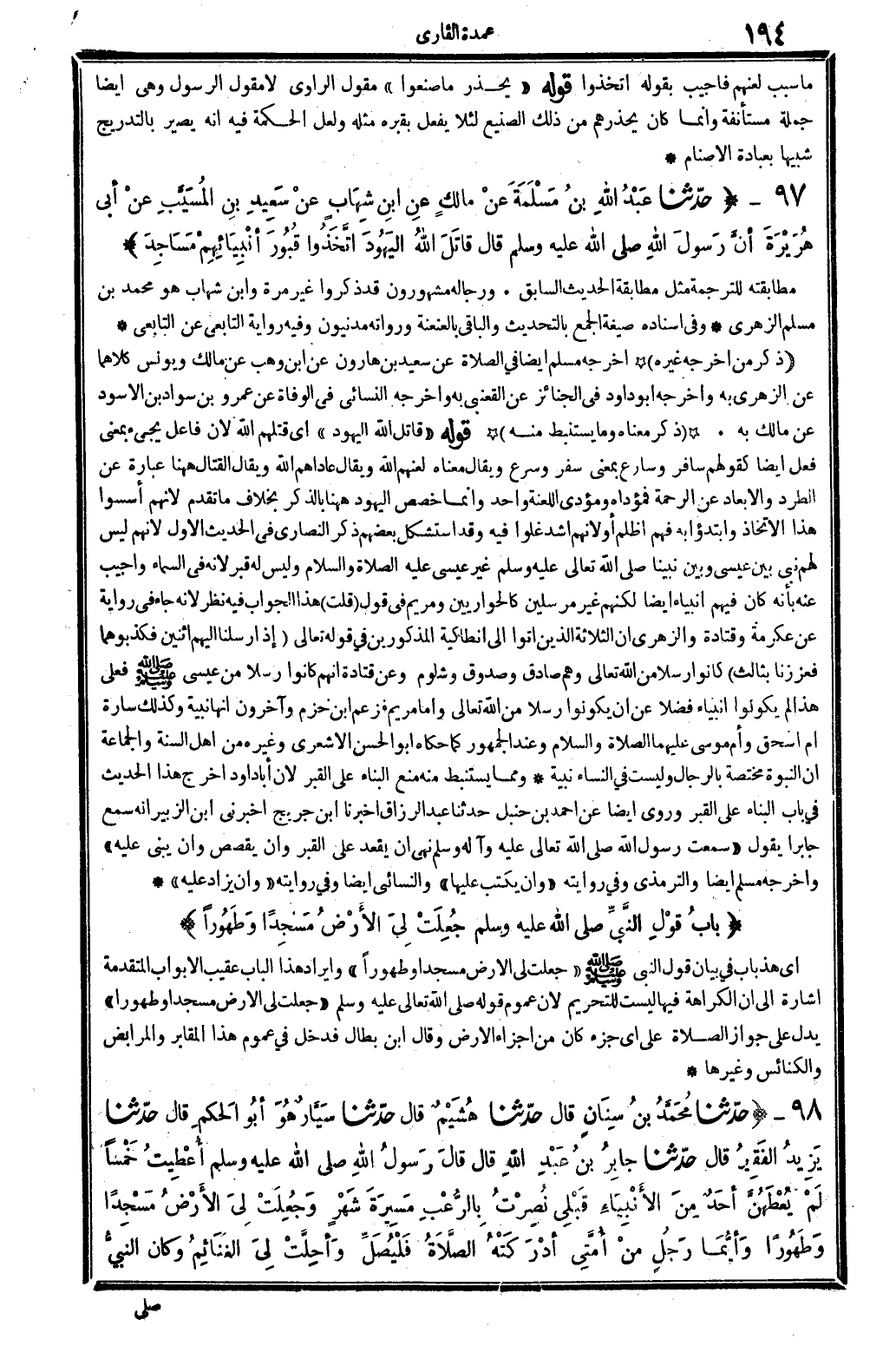 734 - ح دّثنا عَبْدُ اللَّه بنُ مَسْلَمَةَ عنْ مالكٍ عنِ ابنِ شِهَابٍ عَنْ سَعِيدٍ بنِ المُسَيَّبِ عنْ أبي هُرَيْرَةَ أنَّ رَسولَ اللَّهِ قَالَ قاتَلَ اللَّهُ اليَهُودَ اتَّخَذوا وقُبُورَ أنْبِيَائِهِمْ مَسَاجِدَ.