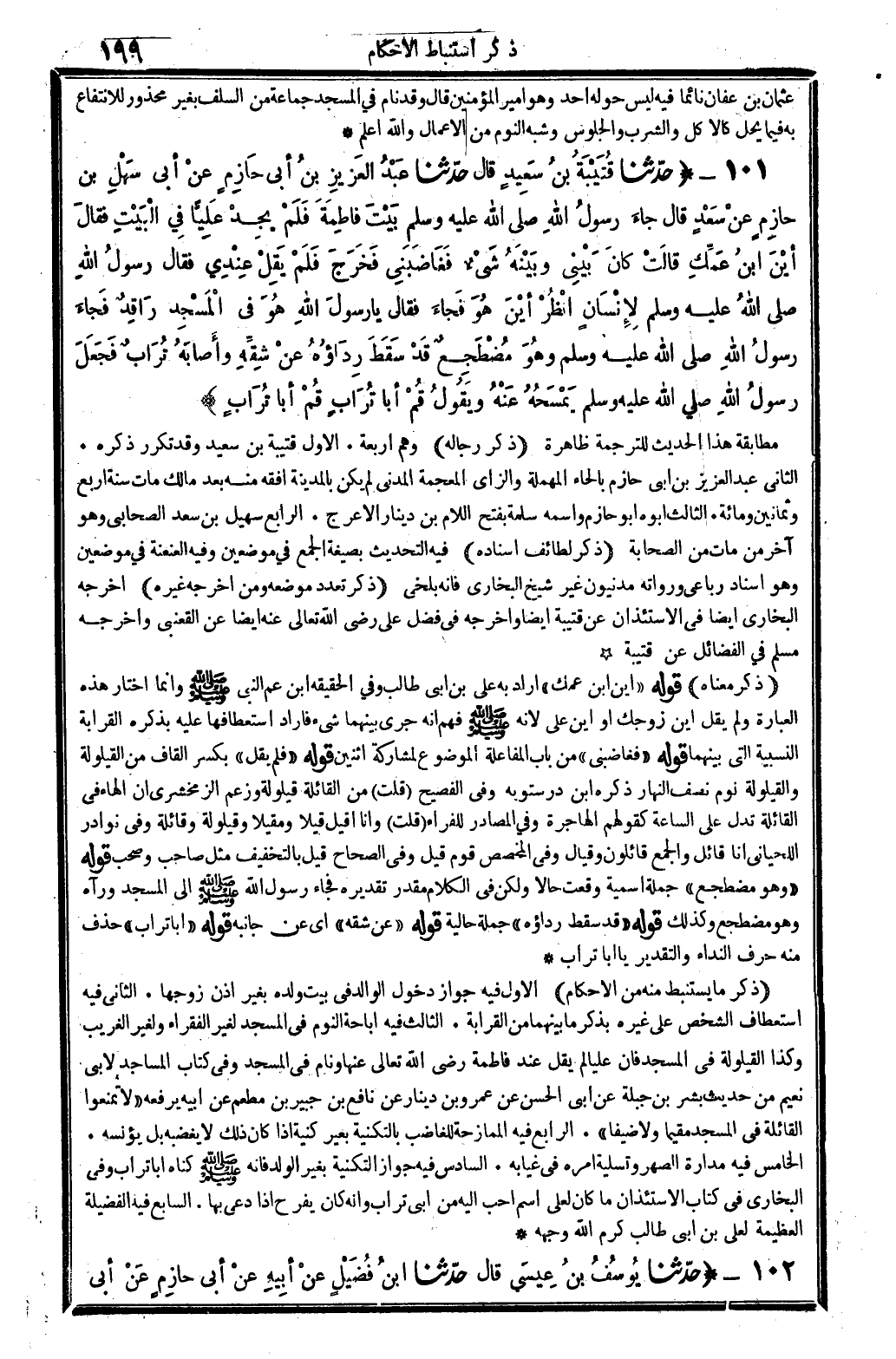101 - (حَدثنَا قُتَيْبَة بن سعيد قَالَ حَدثنَا عبد الْعَزِيز بن أبي حَازِم عَن أبي سهل بن حَازِم عَن سعد قَالَ جَاءَ رَسُول الله - صَلَّى اللَّهُ عَلَيْهِ وَسَلَّم َ - بَيت فَاطِمَة فَلم يجد عليا فِي الْبَيْت فَقَالَ أَيْن ابْن عمك قَالَت كَانَ بيني وَبَينه شَيْء فغاضبني فَخرج فَلم يقل عِنْدِي فَقَالَ رَسُول الله - صَلَّى اللَّهُ عَلَيْهِ وَسَلَّم َ - لإِنْسَان انْظُر أَيْن هُوَ فجَاء فَقَالَ يَا رَسُول الله هُوَ فِي الْمَسْجِد رَاقِد فجَاء رَسُول الله - صَلَّى اللَّهُ عَلَيْهِ وَسَلَّم َ - وَهُوَ مُضْطَجع قد سقط رِدَاؤُهُ عَن شقَّه وأصابه تُرَاب فَجعل رَسُول الله - صَلَّى اللَّهُ عَلَيْهِ وَسَلَّم َ - يمسحه عَنهُ وَيَقُول قُم أَبَا تُرَاب قُم أَبَا تُرَاب) مُطَابقَة هَذَا الحَدِيث للتَّرْجَمَة ظَاهِرَة. (ذكر رِجَاله) وهم أَرْبَعَة. الأول قُتَيْبَة بن سعيد وَقد تكَرر ذكره. الثَّانِي عبد الْعَزِيز بن أبي حَازِم بِالْحَاء الْمُهْملَة وَالزَّاي الْمُعْجَمَة الْمدنِي لم يكن بِالْمَدِينَةِ أفقه مِنْهُ بعد مَالك مَاتَ سنة أَربع وَثَمَانِينَ وَمِائَة. الثَّالِث أَبوهُ أَبُو حَازِم واسْمه سَلمَة بِفَتْح اللَّام بن دِينَار الْأَعْرَج. الرَّابِع سُهَيْل بن سعد الصَّحَابِيّ وَهُوَ آخر من مَاتَ من الصَّحَابَة (ذكر لطائف إِسْنَاده) فِيهِ التحديث بِصِيغَة الْجمع فِي موضِعين وَفِيه العنعنة فِي موضِعين وَهُوَ إِسْنَاد رباعي وَرُوَاته مدنيون غير شيخ البُخَارِيّ فَإِنَّهُ بلخي (ذكر تعدد مَوْضِعه وَمن أخرجه غَيره) أخرجه البُخَارِيّ أَيْضا فِي الاسْتِئْذَان عَن قُتَيْبَة أَيْضا وَأخرجه فِي فضل عَليّ رَضِي الله تَعَالَى عَنهُ أَيْضا عَن القعْنبِي وَأخرجه مُسلم فِي الْفَضَائِل عَن قُتَيْبَة (ذكر مَعْنَاهُ) قَوْله " أَيْن ابْن عمك " أَرَادَ بِهِ عَليّ بن أبي طَالب وَفِي الْحَقِيقَة ابْن عَم النَّبِي - صَلَّى اللَّهُ عَلَيْهِ وَسَلَّم َ - وَإِنَّمَا اخْتَار هَذِه الْعبارَة وَلم يقل أَيْن زَوجك أَو أَيْن عَليّ لِأَنَّهُ - صَلَّى اللَّهُ عَلَيْهِ وَسَلَّم َ - فهم أَنه جرى بَينهمَا شَيْء فَأَرَادَ استعطافها عَلَيْهِ بِذكرِهِ الْقَرَابَة النسبية الَّتِي بَينهمَا قَوْله " فغاضبني " من بَاب المفاعلة الْمَوْضُوع لمشاركة اثْنَيْنِ قَوْله " فَلم يقل " بِكَسْر الْقَاف من القيلولة والقيلولة نوم نصف النَّهَار ذكره ابْن درسْتوَيْه وَفِي الفصيح (قلت) من القائلة قيلولة وَزعم الزَّمَخْشَرِيّ أَن الْهَاء فِي القائلة تدل على السَّاعَة كَقَوْلِهِم الهاجرة وَفِي المصادر للفراء (قلت) وَأَنا أقيل قيلا وَمَقِيلا وقيلولة وقائلة وَفِي نَوَادِر اللحياني أَنا قَائِل وَالْجمع قَائِلُونَ وقيال وَفِي الْمُخَصّص قوم قيل وَفِي الصِّحَاح قيل بِالتَّخْفِيفِ مثل صَاحب وَصَحب قَوْله " وَهُوَ مُضْطَجع " جملَة اسمية وَقعت حَالا وَلَكِن فِي الْكَلَام مُقَدّر تَقْدِيره فجَاء رَسُول الله - صَلَّى اللَّهُ عَلَيْهِ وَسَلَّم َ - إِلَى الْمَسْجِد وَرَآهُ وَهُوَ مُضْطَجع وَكَذَلِكَ قَوْله " قد سقط رِدَاؤُهُ " جملَة حَالية قَوْله " عَن شقَّه " أَي عَن جَانِبه قَوْله " أَبَا تُرَاب " حذف مِنْهُ حرف النداء وَالتَّقْدِير يَا أَبَا تُرَاب (ذكر مَا يستنبط مِنْهُ من الْأَحْكَام) الأول فِيهِ جَوَاز دُخُول الْوَالِد فِي بَيت وَلَده بِغَيْر إِذن زَوجهَا. الثَّانِي فِيهِ استعطاف الشَّخْص على غَيره بِذكر مَا بَينهمَا من الْقَرَابَة. الثَّالِث فِيهِ إِبَاحَة النّوم فِي الْمَسْجِد لغير الْفُقَرَاء ولغير الْغَرِيب وَكَذَا القيلولة فِي الْمَسْجِد فَإِن عليا لم يقل عِنْد فَاطِمَة رَضِي الله تَعَالَى عَنْهَا ونام فِي الْمَسْجِد وَفِي كتاب الْمَسَاجِد لأبي نعيم من حَدِيث بشر بن جبلة عَن أبي الْحسن عَن عَمْرو بن دِينَار عَن نَافِع بن جُبَير بن مطعم عَن أَبِيه يرفعهُ " لَا تمنعوا القائلة فِي الْمَسْجِد مُقيما 