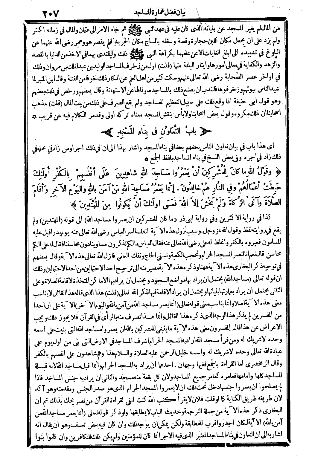 وَقَوْلُ اللَّهِ {مَا كانَ لِلْمُشْرِكِينَ أنْ يَعْمُرُوا مَسَاجِدَ اللَّهِ شاهِدِينَ عَلَى أنْفُسِهِمْ بِالكُفْرِ أُولَئِكَ حَبِطَتْ أعْمَالُهُمْ وفِي النَّارِ هُمْ خالِدُونَ. إِنَّما يَعْمُرُ مَسَاجِدَ اللَّهِ مَنْ آمَنَ باللَّهِ واليَوْمِ الآخِرِ وَأَقَامَ الصَّلاَةَ وَآتَى الزَّكاةَ وَلَمْ يَخْشَى إِلاَّ اللَّهَ فَعَسَى أولَئِكَ أنْ يَكونُوا مِنَ المُهْتَدِينَ} (التَّوْبَة: 71 81) .