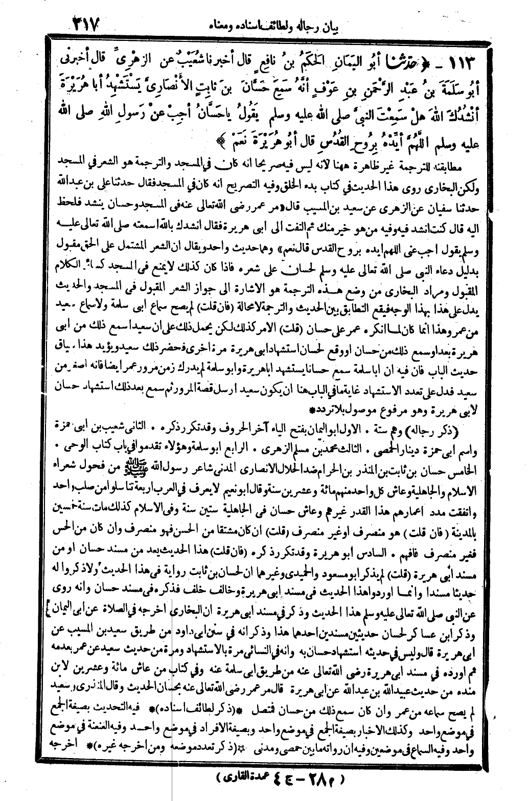 فَإِن قلت: هَذَا الحَدِيث يعد من مُسْند حسان أَو من مُسْند أبي هُرَيْرَة؟ قلت: لم يذكر أَبُو مَسْعُود والْحميدِي وَغَيرهمَا أَن لحسان بن ثَابت رِوَايَة فِي هَذَا الحَدِيث، وَلَا ذكرُوا لَهُ حَدِيثا مُسْندًا، وَإِنَّمَا أوردوا هَذَا الحَدِيث فِي مُسْند أبي هُرَيْرَة، وَخَالف خلف فَذكره فِي مُسْند حسان، وَأَنه روى عَن النَّبِي، هَذَا الحَدِيث، وَذكر فِي مُسْند أبي هُرَيْرَة أَن البُخَارِيّ أخرجه فِي الصَّلَاة عَن أبي الْيَمَان، وَذكر ابْن عَسَاكِر لحسان حديثين مسندين: أَحدهمَا هَذَا، وَذكر أَنه فِي (سنَن أبي دَاوُد) من طَرِيق سعيد بن الْمسيب عَن أبي هُرَيْرَة، قَالَ: وَلَيْسَ فِي حَدِيثه استشهاد حسان بِهِ، وَأَنه فِي النَّسَائِيّ مرّة بالاستشهاد، وَمرَّة من حَدِيث سعيد عَن عمر بِعَدَمِهِ، ثمَّ أوردهُ فِي مُسْند أبي هُرَيْرَة رَضِي اتعالى عَنهُ، من طَرِيق أبي سَلمَة عَنهُ. وَفِي كتاب (من عَاشَ مائَة وَعشْرين) لِابْنِ مَنْدَه: من حَدِيث عبيد ابْن عبد اعن أبي هُرَيْرَة، قَالَ: مر عمر رَضِي اتعالى عَنهُ، بِحسان ... . الحَدِيث، وَقَالَ الْمُنْذِرِيّ: وَسَعِيد لم يَصح سَمَاعه من عمر، وَإِن كَانَ سمع ذَلِك من حسان فمتصل.