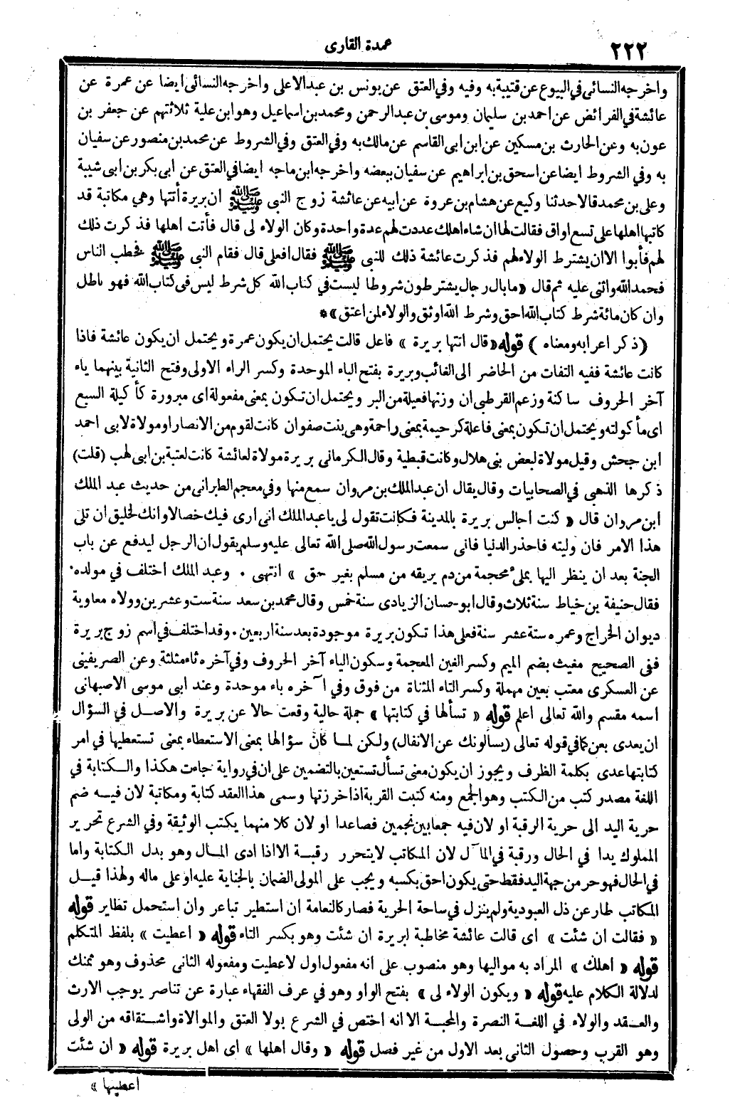 ذكر اعراب وَمَعْنَاهُ قَوْله: (قَالَ: اتتها بَرِيرَة) ، فَاعل: قَالَت، يحْتَمل أَن يكون: عمْرَة، وَيحْتَمل أَن يكون: عَائِشَة، فَإِذا كَانَت: عَائِشَة، فَفِيهِ الْتِفَات من الْحَاضِر إِلَى الْغَائِب، وبريرة، بِفَتْح الْبَاء الْمُوَحدَة وَكسر الرَّاء الأولى وَفتح الثَّانِيَة بَينهمَا يَاء آخر الْحُرُوف سَاكِنة، وَزعم الْقُرْطُبِيّ أَن وَزنهَا. فعيلة، من الْبر، وَيحْتَمل أَن تكون بِمَعْنى مفعولة أَي: مبرورة، كأكيلة السَّبع أَي مأكولته وَيحْتَمل أَن تكون بِمَعْنى: فاعلة، كرحيمة بِمَعْنى: راحمة، وَهِي بنت صَفْوَان، كَانَت لقوم من الْأَنْصَار، أَو مولاة لأبي أَحْمد ابْن جحش، وَقيل: مولاة لبَعض بني هِلَال، وَكَانَت قبطية.