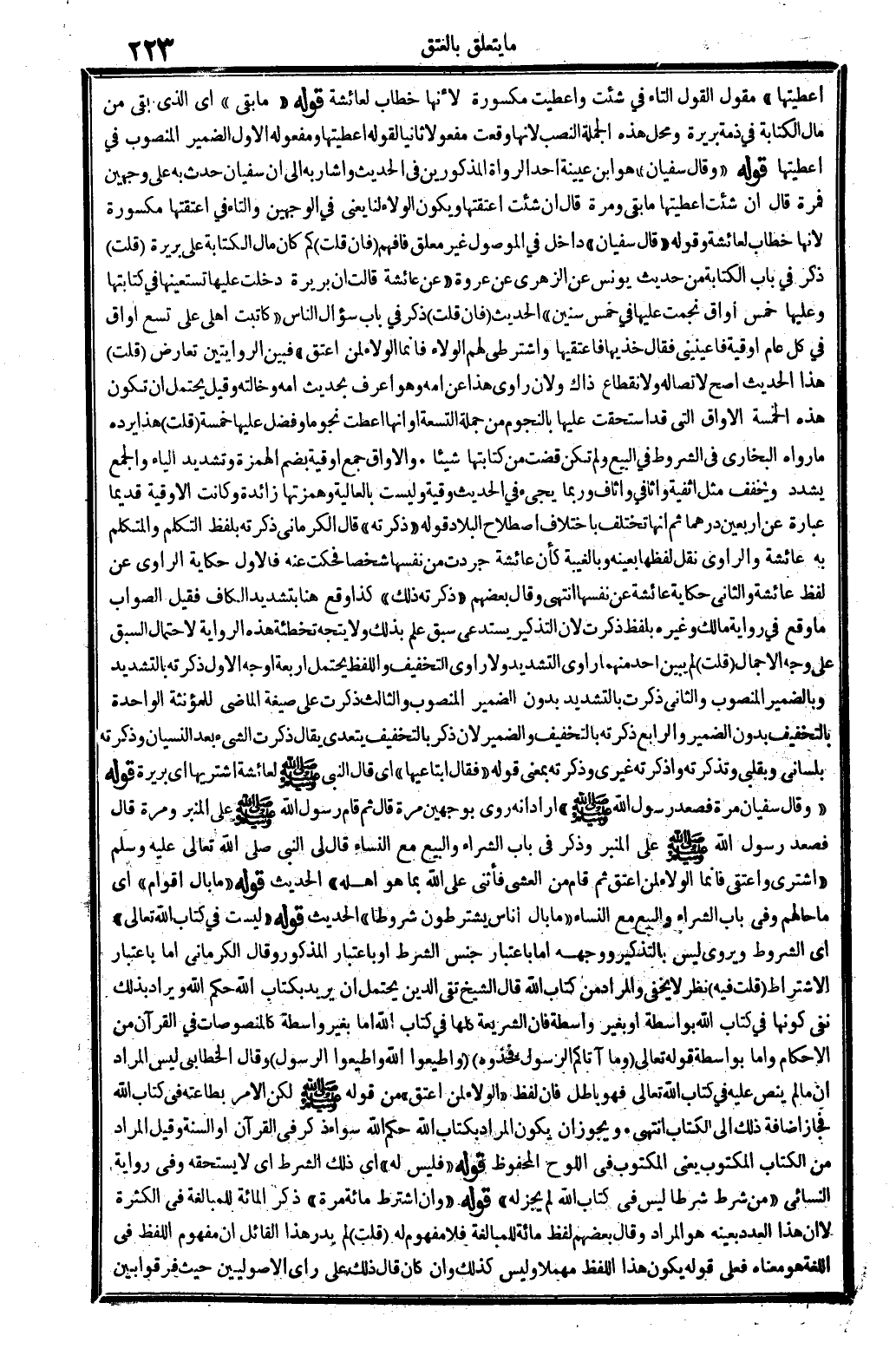 اعطيتها) مقول القَوْل، التَّاء: فِي شِئْت وَأعْطيت، مَكْسُورَة لِأَنَّهَا خطاب لعَائِشَة. قَوْله: (مَا بَقِي) أَي: الَّذِي بَقِي من مَال الْكِتَابَة فِي ذمَّة بَرِيرَة، وَمحل هَذِه الْجُمْلَة النصب لِأَنَّهَا وَقعت مَفْعُولا ثَانِيًا لقَوْله؛ أعطيتهَا، ومفعوله الأول الضَّمِير الْمَنْصُوب فِي: أعطيتهَا. قَوْله: (وَقَالَ سُفْيَان) ، هُوَ ابْن عُيَيْنَة أحد الروَاة الْمَذْكُورين فِي الحَدِيث، وَأَشَارَ بِهِ إِلَى أَن سُفْيَان حدث بِهِ. على وَجْهَيْن: فَمرَّة قَالَ: إِن شِئْت أعطيتهَا مَا بَقِي، وَمرَّة قَالَ: إِن شِئْت أعتقتها، وَيكون الْوَلَاء لنا، يَعْنِي فِي الْوَجْهَيْنِ، و: التَّاء، فِي أعتقتها مَكْسُورَة لِأَنَّهَا خطاب لعَائِشَة. وَقَوله: (قَالَ سُفْيَان) دَاخل فِي الْمَوْصُول غير مُعَلّق. فَافْهَم فَإِن قلت: كم كَانَ مَال الْكِتَابَة على بَرِيرَة؟ قلت: ذكر ف بَاب الْكِتَابَة من حَدِيث يُونُس عَن الزُّهْرِيّ عَن عُرْوَة: (عَن عَائِشَة قَالَت: إِن بَرِيرَة دخلت عَلَيْهَا تستعينها فِي كتَابَتهَا وَعَلَيْهَا خمس أَوَاقٍ نجمت عَلَيْهَا فِي خمس سِنِين) الحَدِيث فَإِن قلت: ذكر فِي بَاب سُؤال النَّاس: (كاتبت أَهلِي على تسع أَوَاقٍ فِي كل عَام أُوقِيَّة فأعينيني، فَقَالَ: خذيها فأعتقيها واشترطي لَهُم الْوَلَاء فَإِنَّمَا الْوَلَاء لمن أعتق) ، فَبين الرِّوَايَتَيْنِ تعَارض. قلت: هَذَا الحَدِيث أصح لاتصاله ولانقطاع ذَاك، وَلِأَن رَاوِي هَذَا عَن أمه وَهُوَ أعرف بِحَدِيث أمه وخالته، وَقيل: يحْتَمل أَن تكون هَذِه الْخَمْسَة الأواق الَّتِي قد اسْتحقَّت عَلَيْهَا بالنجوم من جملَة التِّسْعَة، أَو أَنَّهَا أَعْطَتْ نجوماً وَفضل عَلَيْهَا خَمْسَة، قلت: هَذَا يردهُ مَا رَوَاهُ البُخَارِيّ فِي الشُّرُوط: فِي البيع، وَلم تكن قَضَت من كتَابَتهَا شَيْئا. والأواق جمع: أُوقِيَّة، بِضَم الْهمزَة وَتَشْديد الْيَاء، وَالْجمع يشدد ويخفف مثل: أثفية وأثافي وأثافٍ، وَرُبمَا يَجِيء فِي الحَدِيث: وقية، وَلَيْسَت بِالْعَالِيَةِ وهمزتها زَائِدَة، وَكَانَت الْأُوقِيَّة قَدِيما عبارَة عَن أَرْبَعِينَ درهما، ثمَّ أَنَّهَا تخْتَلف باخْتلَاف اصْطِلَاح الْبِلَاد. قَوْله: (ذكرته) ، قَالَ الْكرْمَانِي: ذكرته، بِلَفْظ التَّكَلُّم، والمتكلم بِهِ عَائِشَة، والراوي نقل لَفظهَا بِعَيْنِه، وبالغيبة: كَأَن عَائِشَة جردت من نَفسهَا شخصا فحكت عَنْهَا، فَالْأول: حِكَايَة الرَّاوِي عَن لفظ عَائِشَة، وَالثَّانِي: حِكَايَة عَائِشَة عَن نَفسهَا. انْتهى. وَقَالَ بَعضهم: (ذكرته ذَلِك) ، كَذَا وَقع هُنَا بتَشْديد الْكَاف، فَقيل: الصَّوَاب مَا وَقع فِي رِوَايَة مَالك وَغَيره بِلَفْظ: ذكرت، لِأَن التَّذْكِير يَسْتَعْدِي سبق علم بذلك، وَلَا يتَّجه تخطئة هَذِه الرِّوَايَة لاحْتِمَال السَّبق على وَجه الْإِجْمَال قلت: لم يبين أحد مِنْهُمَا رَاوِي التَّشْدِيد وَلَا رَاوِي التَّخْفِيف، وَاللَّفْظ يحْتَمل أَرْبَعَة أوجه. الأول: ذكرته، بِالتَّشْدِيدِ وبالضمير الْمَنْصُوب. وَالثَّانِي: ذكرت، بِالتَّشْدِيدِ بِدُونِ الضَّمِير الْمَنْصُوب. وَالثَّالِث: ذكرت، على صِيغَة الْمَاضِي للمؤنثة الْوَاحِدَة بِالتَّخْفِيفِ بِدُونِ الضَّمِير. وَالرَّابِع: ذكرته بِالتَّخْفِيفِ، وَالضَّمِير لِأَن ذكر بِالتَّخْفِيفِ يعدى يُقَال: ذكرت الشَّيْء بعد النسْيَان، وذكرته بلساني وبقلبي وتذكرته وأذكرته غَيْرِي وذكرته، بِمَعْنى. قَوْله: (فَقَالَ ابتاعيها) أَي: قَالَ النَّبِي لعَائِشَة: اشتريها، أَي: بَرِيرَة. قَوْله: (وَقَالَ سُفْيَان مرّة فَصَعدَ رَسُول ا) أَرَادَ أَنه رُوِيَ بِوَجْهَيْنِ: مرّة قَالَ: ثمَّ قَامَ رَسُول الله على الْمِنْبَر، وَمرَّة قَالَ: فَصَعدَ رَسُول الله على الْمِنْبَر، وَذكر فِي بَاب الشِّرَاء وَالْبيع مَعَ النِّسَاء، قَالَ لي النَّبِي: (اشْترِي واعتقي فَإِنَّمَا الْوَل