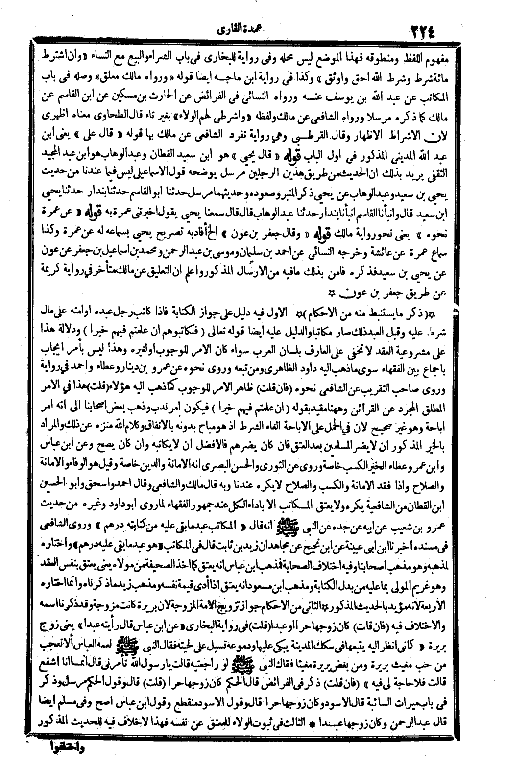 مَفْهُوم اللَّفْظ ومنطوقه، فَهَذَا الْموضع لَيْسَ مَحَله، وَفِي رِوَايَة للْبُخَارِيّ فِي بَاب الشِّرَاء وَالْبيع مَعَ النِّسَاء: (وَإِن اشْترط مائَة شَرط، وَشرط اأحق وأوثق) ، وَكَذَا فِي رِوَايَة ابْن مَاجَه أَيْضا. قَوْله: (وَرَوَاهُ مَالك) ، مُعَلّق وَصله فِي بَاب الْمكَاتب: عَن عبد ابْن يُوسُف عَنهُ، وَرَوَاهُ النَّسَائِيّ فِي الْفَرَائِض عَن الْحَارِث بن مِسْكين عَن ابْن الْقَاسِم عَن مَالك، كَمَا ذكره مُرْسلا، وَرَوَاهُ الشَّافِعِي عَن مَالك. وَلَفظه: (واشرطي لَهُم الْوَلَاء) ، بِغَيْر: تَاء. قَالَ الطَّحَاوِيّ: مَعْنَاهُ أظهري، لِأَن الإشراط: الْإِظْهَار. وَقَالَ الْقُرْطُبِيّ: وَهِي رِوَايَة تفرد الشَّافِعِي عَن مَالك بهَا. قَوْله: (قَالَ عَليّ) يَعْنِي ابْن عبد االمديني الْمَذْكُور فِي أول الْبَاب. قَوْله: (قَالَ يحيى) هُوَ ابْن سعيد الْقطَّان و: (عبد الْوَهَّاب) ، هُوَ ابْن عبد الْمجِيد الثَّقَفِيّ، يُرِيد بذلك أَن الحَدِيث من طَرِيق هذَيْن الرجلَيْن مُرْسل، يُوضحهُ قَول الْإِسْمَاعِيلِيّ: لَيْسَ فِيمَا عندنَا من حَدِيث يحيى بن سعيد وَعبد الْوَهَّاب عَن يحيى ذَلِك الْمِنْبَر وصعوده، وحديثهما مُرْسل. حدّثنا أَبُو الْقَاسِم حدّثنا بنْدَار حدّثنا يحيى بن سعيد، قَالَ: وأنبأنا الْقَاسِم أَنبأَنَا بنْدَار حدّثنا عبد الْوَهَّاب، قَالَ: قَالَ: سمعنَا يحيى يَقُول: أَخْبَرتنِي عمْرَة بِهِ. قَوْله: (عَن عمْرَة نَحوه) يَعْنِي: نَحْو رِوَايَة مَالك. قَوْله: (وَقَالَ جَعْفَر بن عون) الخ، أَفَادَ بِهِ تَصْرِيح يحيى بِسَمَاعِهِ لَهُ عَن عمْرَة، وَكَذَا سَماع عمْرَة عَن عَائِشَة، وخرجه النَّسَائِيّ عَن أَحْمد بن سُلَيْمَان ومُوسَى بن عبد الرَّحْمَن وَمُحَمّد بن إِسْمَاعِيل بن جَعْفَر عَن عون عَن يحيى بن سعيد، فَذكره فأمن بذلك مَا فِيهِ من الْإِرْسَال الْمَذْكُور، وَأعلم أَن التَّعْلِيق عَن مَالك مُتَأَخّر فِي رِوَايَة كَرِيمَة عَن طَرِيق جَعْفَر بن عون.