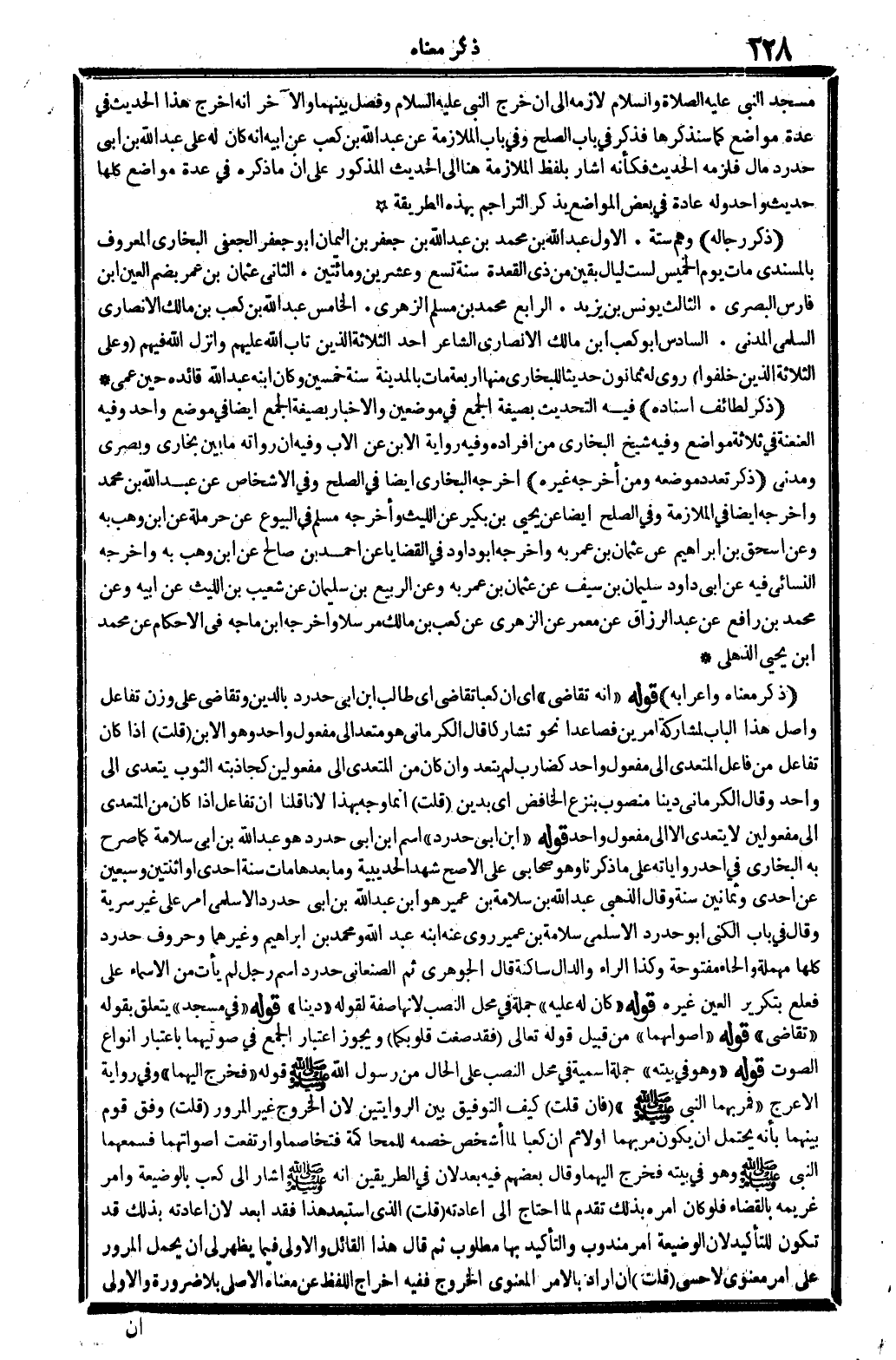 مَسْجِد النَّبِي عَلَيْهِ الصَّلَاة وَالسَّلَام، لَازمه إِلَى أَن خرج النَّبِي عَلَيْهِ السَّلَام، وَفصل بَينهمَا. وَالْآخر: أَنه أخرج هَذَا الحَدِيث فِي عدَّة مَوَاضِع كَمَا سنذكرها، فَذكر فِي بَاب الصُّلْح وَفِي بَاب الْمُلَازمَة عَن عبد ابْن كَعْب عَن أَبِيه أَنه كَانَ لَهُ على عبد ابْن أبي حَدْرَد مَال فَلَزِمَهُ ... الحَدِيث، فَكَأَنَّهُ أَشَارَ بِلَفْظ الْمُلَازمَة هُنَا، إِلَى الحَدِيث الْمَذْكُور، على أَن مَا ذكره فِي عدَّة مَوَاضِع كلهَا حَدِيث وَاحِد، وَله عَادَة فِي بعض الْمَوَاضِع يذكر التراجم بِهَذِهِ الطَّرِيقَة.