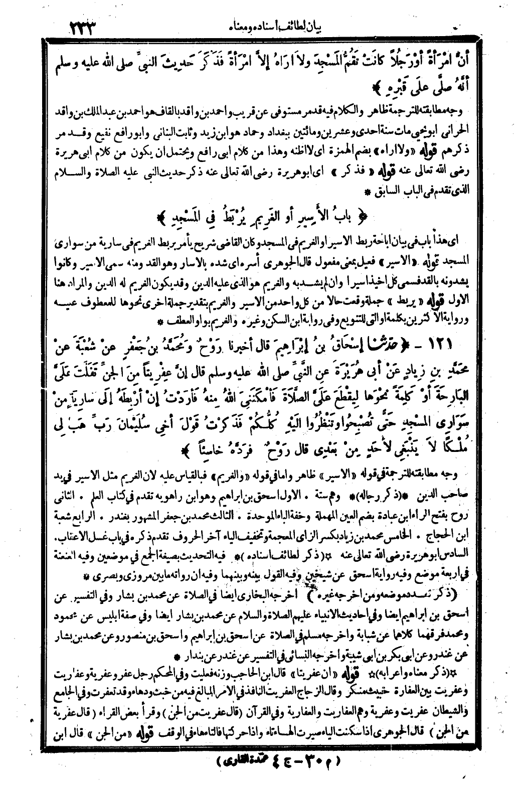 164121 - ح دّثنا إسْحَاقُ بنُ إبْرَاهِيمَ قَالَ أخبرنَا رَوْحٌ وَمُحَمَّدُ بنُ جَعْفَرٍ عنْ شُعْبَةَ عنْ محَمَّدٍ بنِ زِيادٍ عَنْ أبي هُرَيْرَةَ عنِ النَّبيِّ قَالَ إنَّ عِفْرِيتاً مِنَ الجنِّ تَفَلَّتَ عَلَيَّ البَارِحَةَ أوْ كَلِمَةً نحْوَها لِيقْطَعَ عَلَيَّ الصَّلاَةَ فَأَمْكَنَنِي اللَّهُ مِنهُ فَأَرَدْتُ إِنْ أرْبِطَهُ إِلَى سارِية مِنْ سَوَارِي المسْجدِ حَتَّى تُصْبِحُوا وتَنْظُرُوا إِلَيْهِ كُلُّكُمْ فَذَكرْتُ قَوْلَ أخِي سُلَيْمَانَ رَبِّ هَبْ لِي مُلْكاً لاَ يَنْبَغِي لأحَدٍ مِنْ بَعْدي قَالَ رَوْحٌ فرَدَّهُ خاسِئاً. (الحَدِيث 164 أَطْرَافه فِي: 0121، 4823، 3243، 8084) .
