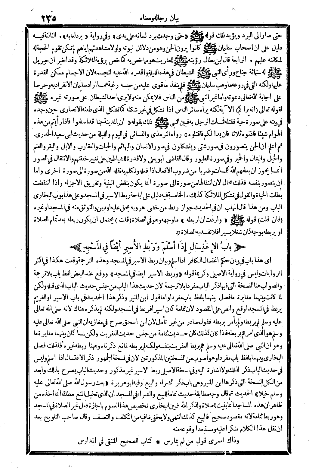 الْخَامِسَة: فِيهِ دَلِيل على إِبَاحَة ربط الْأَسير فِي الْمَسْجِد، وعل هَذَا بوب البُخَارِيّ الْبَاب، وَمن هَذَا قَالَ الْمُهلب: إِن فِي الحَدِيث جَوَاز ربط من خشِي هروبه بِحَق عَلَيْهِ أَو دين، والتوثق مِنْهُ فِي الْمَسْجِد أَو غَيره. فَإِن قلت: قَوْله: (وَأَرَدْت أَن أربطه) ، مَا وَجهه وَهُوَ فِي الصَّلَاة؟ قلت: يحْتَمل أَن يكون ربطه بعد تَمام الصَّلَاة، أَو يربطه بِوَجْه كَانَ شغلاً يَسِيرا فَلَا تفْسد بِهِ الصَّلَاة.