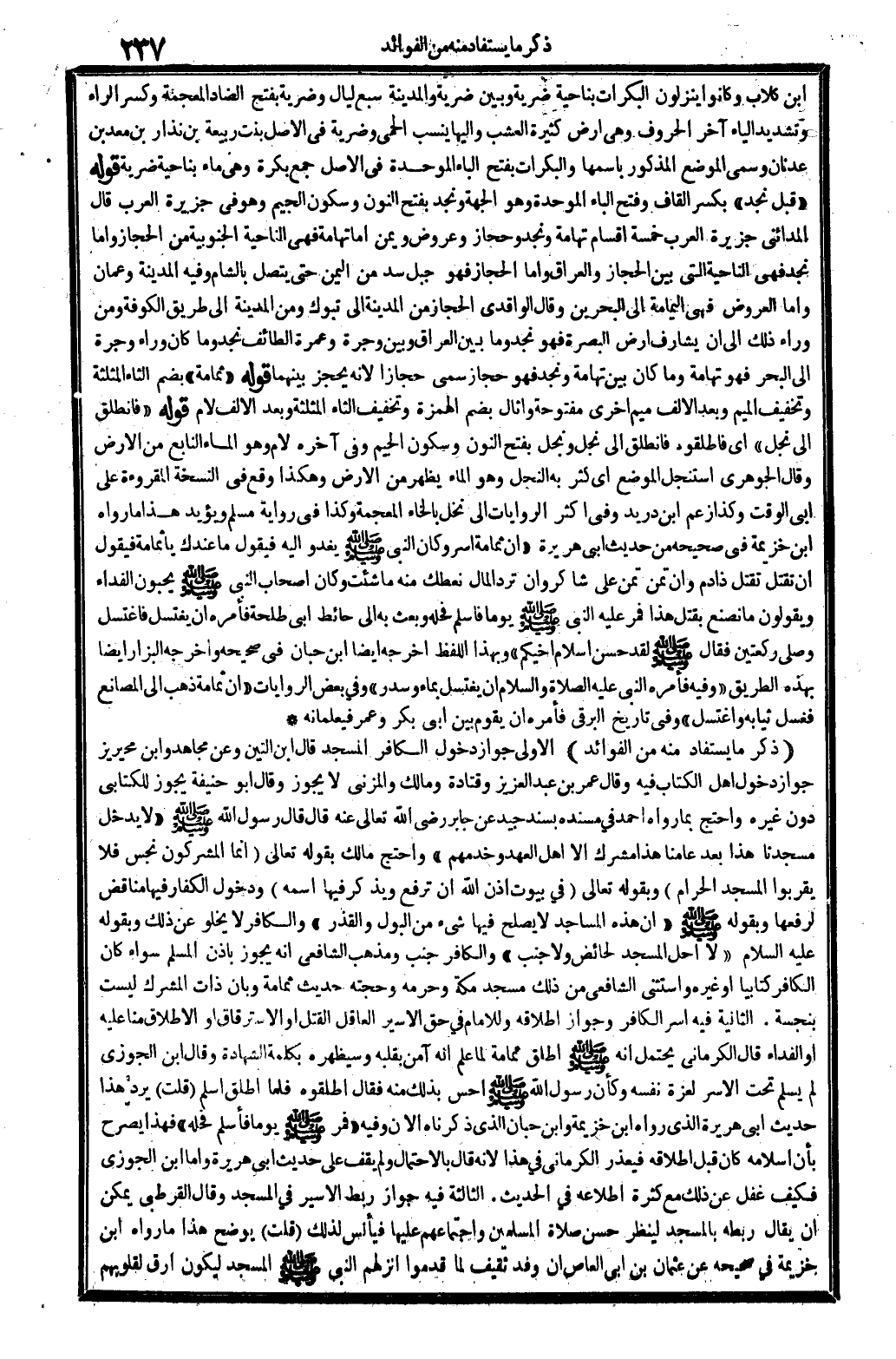 ذكر مَا يُسْتَفَاد مِنْهُ من الْفَوَائِد. الأولى: جَوَاز دُخُول الْكَافِر الْمَسْجِد. قَالَ ابْن التِّين: وَعَن مُجَاهِد وَابْن محيريز جَوَاز دُخُول أهل الْكتاب فِيهِ، وَقَالَ عمر بن عبد الْعَزِيز وَقَتَادَة وَمَالك والمزني: لَا يجوز. وَقَالَ أَبُو حنيفَة؛ يجوز للكتابي دون غَيره، وَاحْتج بِمَا رَوَاهُ أَحْمد فِي (مُسْنده) بِسَنَد جيد: عَن جَابر رَضِي اتعالى عَنهُ، قَالَ: قَالَ رَسُول ا: (لَا يدْخل مَسْجِدنَا هَذَا بعد عامنا هَذَا مُشْرك إِلاَّ أهل الْعَهْد وخدمهم) وَاحْتج مَالك بقوله تَعَالَى: {إِنَّمَا الْمُشْركُونَ نجس فَلَا يقربُوا الْمَسْجِد الْحَرَام} (التَّوْبَة: 82) وَبِقَوْلِهِ تَعَالَى: {فِي بيُوت أذن اأن ترفع وَيذكر فِيهَا اسْمه} (النُّور: 63) وَدخُول الْكفَّار فِيهَا مُنَاقض لرفعها، وَبِقَوْلِهِ: (إِن هَذِه الْمَسَاجِد لَا يصلح فِيهَا شَيْء من الْبَوْل والقذر) . وَالْكَافِر لَا يَخْلُو عَن ذَلِك، وَبِقَوْلِهِ عَلَيْهِ السَّلَام: (لَا أحل الْمَسْجِد لحائض وَلَا جنب) وَالْكَافِر جنب. وَمذهب الشَّافِعِي أَنه: يجوز بِإِذن الْمُسلم، سَوَاء كَانَ الْكَافِر كتابياً أَو غَيره، وَاسْتثنى الشَّافِعِي من ذَلِك مَسْجِد مَكَّة وَحرمه، وحجته حَدِيث ثُمَامَة، وَبِأَن ذَات الْمُشرك لَيست بنجسة.