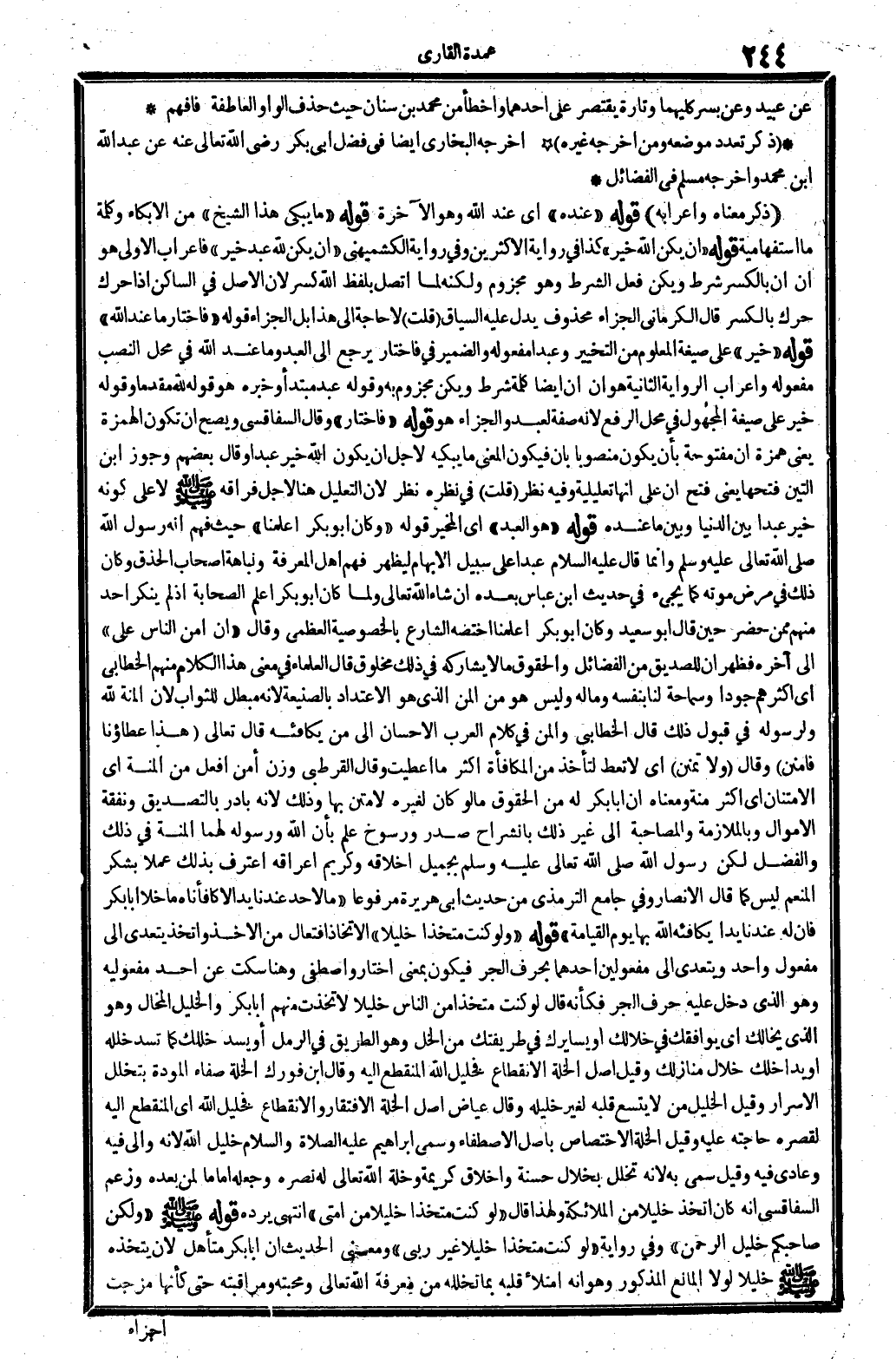 ذكر مَعْنَاهُ وَإِعْرَابه: قَوْله: (عِنْده) أَي، عِنْد اوهو: الْآخِرَة. قَوْله: (مَا يبكي هَذَا الشَّيْخ) من الإبكاء، وَكلمَة: مَا، استفهامية. قَوْله: (إِن يكن اخير) ، كَذَا فِي رِوَايَة الْأَكْثَرين، وَفِي رِوَايَة الْكشميهني: (إِن يكن عبد خير) ، فإعراب الأولى: هُوَ: أَن: إِن، بِالْكَسْرِ شَرط، ويكن، فعل الشَّرْط وَهُوَ مجزوم، وَلكنه لما اتَّصل بِلَفْظ: ا، كسر لِأَن الأَصْل فِي السَّاكِن إِذا حرك حرك بِالْكَسْرِ. قَالَ الْكرْمَانِي: الْجَزَاء مَحْذُوف يدل عَلَيْهِ السِّيَاق. قلت: لَا حَاجَة إِلَى هَذَا، بل الْجَزَاء قَوْله: (فَاخْتَارَ مَا عِنْد ا) ، قَوْله: (خير) على صِيغَة الْمَعْلُوم من: التَّخْيِير، وعبداً، مَفْعُوله و: الضَّمِير فِي: فَاخْتَارَ، يرجع إِلَى: العَبْد، و: مَا عِنْد ا، فِي مَحل النصب مَفْعُوله. وإعراب الرِّوَايَة الثَّانِيَة: هُوَ أَن: إِن أَيْضا كلمة شَرط، و: يكن، مجزوم بِهِ. وَقَوله: عبد، مُبْتَدأ وَخَبره هُوَ قَوْله: مقدما، وَقَوله: خير، على صِيغَة الْمَجْهُول فِي مَحل الرّفْع لِأَنَّهُ صفة لعبد، وَالْجَزَاء هُوَ قَوْله: (فَاخْتَارَ) . وَقَالَ السفاقسي: وَيصِح أَن تكون الْهمزَة، يَعْنِي همزَة: أَن، مَفْتُوحَة بِأَن يكون مَنْصُوبًا: بِأَن، فَيكون الْمَعْنى مَا يبكيه لأجل أَن يكون اخير عبدا. وَقَالَ بَعضهم: وَجوز ابْن التِّين فتحهَا، يَعْنِي: فتح: أَن، على أَنَّهَا تعليلية، وَفِي نظر. قلت: فِي نظره نظر، لِأَن التَّعْلِيل هُنَا لأجل فِرَاقه لَا على كَونه خيّر عبدا بَين الدُّنْيَا وَبَين مَا عِنْده. قَوْله: (هُوَ العَبْد) ، أَي: الْمُخَير: قَوْله: (وَكَانَ أَبُو بكر أعلمنَا) حَيْثُ فهم أَنه رَسُول ا، وَإِنَّمَا قَالَ عَلَيْهِ السَّلَام: عبدا، على سَبِيل الْإِبْهَام ليظْهر فهم أهل الْمعرفَة ونباهة أَصْحَاب الحذق، وَكَانَ ذَلِك فِي مرض مَوته كَمَا يَجِيء فِي حَدِيث ابْن عَبَّاس بعده، إِن شَاءَ اتعالى. وَلما كَانَ أَبُو بكر أعلم الصَّحَابَة، إِذْ لم يُنكر أحد مِنْهُم مِمَّن حضر حِين قَالَ أَبُو سعيد: وَكَانَ أَبُو بكر أعلمنَا، اختصه الشَّارِع بالخصوصية الْعُظْمَى. وَقَالَ: (إِن أمنَّ النَّاس عليَّ) إِلَى آخِره فَظهر أَن للصديق من الْفَضَائِل والحقوق مَا لَا يُشَارِكهُ فِي ذَلِك مَخْلُوق. قَالَ الْعلمَاء: فِي ممعنى هَذَا الْكَلَام، مِنْهُم الْخطابِيّ: أَي أَكْثَرهم جوداً وسماحة لنا بِنَفسِهِ وَمَاله، وَلَيْسَ هُوَ من الْمَنّ الَّذِي هُوَ الِاعْتِدَاد بالصنيعة، لِأَنَّهُ مُبْطل للثَّواب، لِأَن الْمِنَّة وَلِرَسُولِهِ فِي قبُول ذَلِك. قَالَ الْخطابِيّ: والمن فِي كَلَام الْعَرَب الْإِحْسَان إِلَى من يُكَافِئهُ. قَالَ تَعَالَى: {هَذَا عطاؤنا فَامْنُنْ} (ص: 93) وَقَالَ: {وَلَا تمنن} (المدثر: 6) أَي: لَا تعط لتأْخذ من الْمُكَافَأَة أَكثر مَا أَعْطَيْت. وَقَالَ الْقُرْطُبِيّ: وزن: أَمن، أفعل، من: الْمِنَّة، أَي الإمتنان أَي: أَكثر منَّة. وَمَعْنَاهُ: أَن أَبَا بكر لَهُ من الْحُقُوق مَا لَو كَانَ لغيره لَا متن بهَا، وَذَلِكَ لِأَنَّهُ بَادر بالتصديق وَنَفَقَة الْأَمْوَال، وبالملازمة والمصاحبة إِلَى غير ذَلِك بانشراح صدر ورسوخ علم بِأَن اورسوله لَهما الْمِنَّة فِي ذَلِك وَالْفضل، لَكِن رَسُول ا، بجميل أخلاقه وكريم أعراقه اعْترف بذل عملا بشكر الْمُنعم، لَيْسَ كَمَا قَالَ الْأَنْصَار. وَفِي (جَامع التِّرْمِذِيّ) ، من حَدِيث أبي هُرَيْرَة مَرْفُوعا: (مَا لأحد عندنَا يَد إلاَّ كافأنا مَا خلا أَبَا بكر فَإِن لَهُ عندنَا يدا يُكَافِئهُ ابها يَوْم الْقِيَامَة) . قَوْله: (وَلَو كنت متخذاً خَلِيلًا) ، الاتخاذ: افتعال من الْأَخْذ، وَاتخذ يتَعَدَّى إِلَى مفعول وَاحِد، وَيَتَعَدَّى إِلَى مفعولين أَحدهمَا بِحرف الْجَرّ، فَيكون بِمَعْنى: اخْتَار وَاصْطفى، وَهنا سكت عَن أحد مفعوليه وَهُوَ الَّذِي دخل عَلَيْهِ حرف الْجَرّ، فَكَأَنَّهُ قَالَ: لَو كنت 